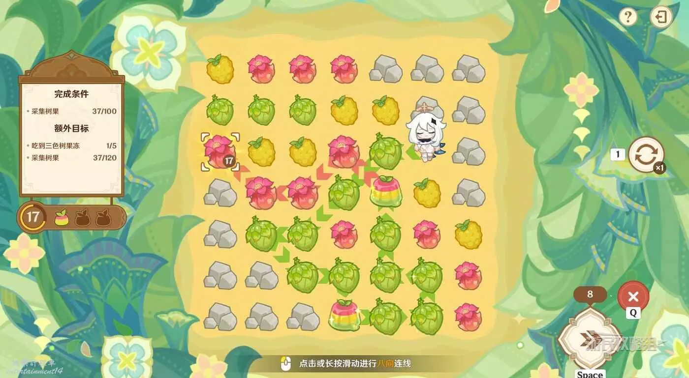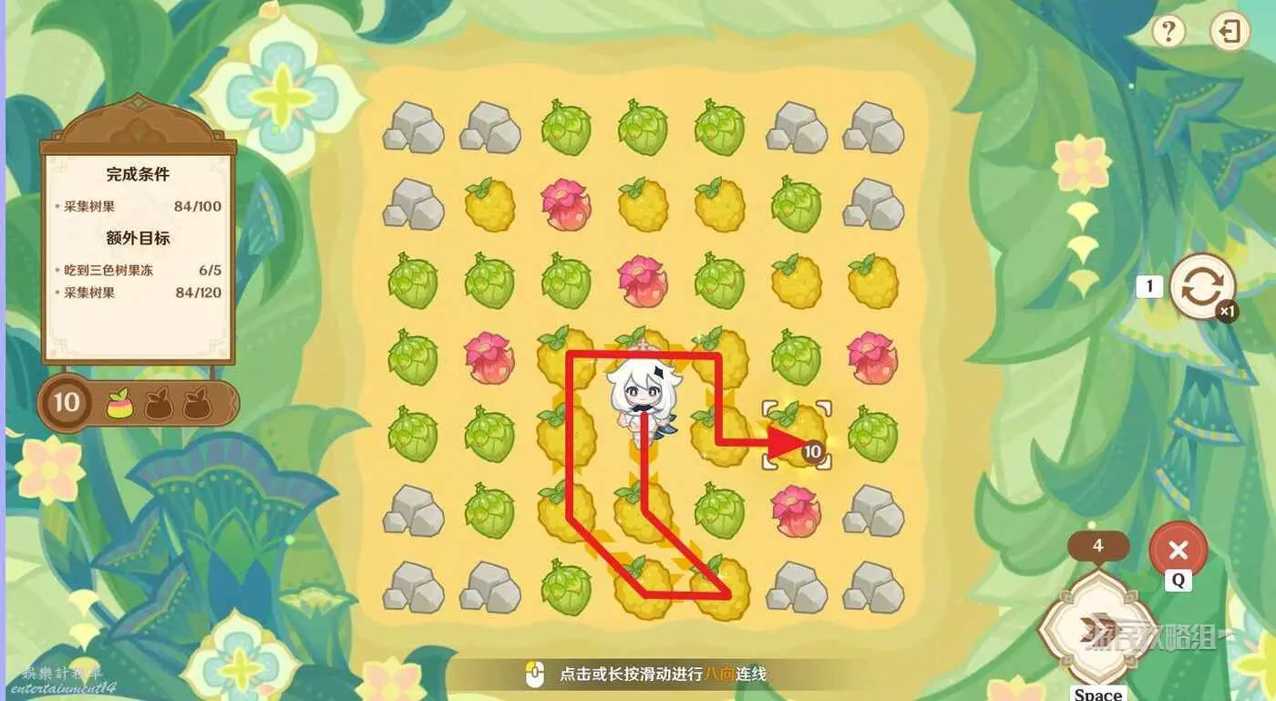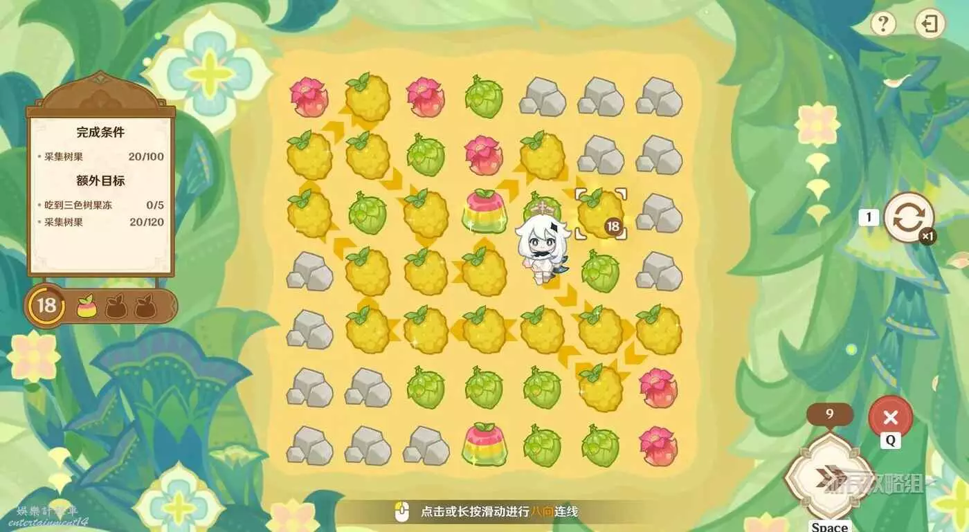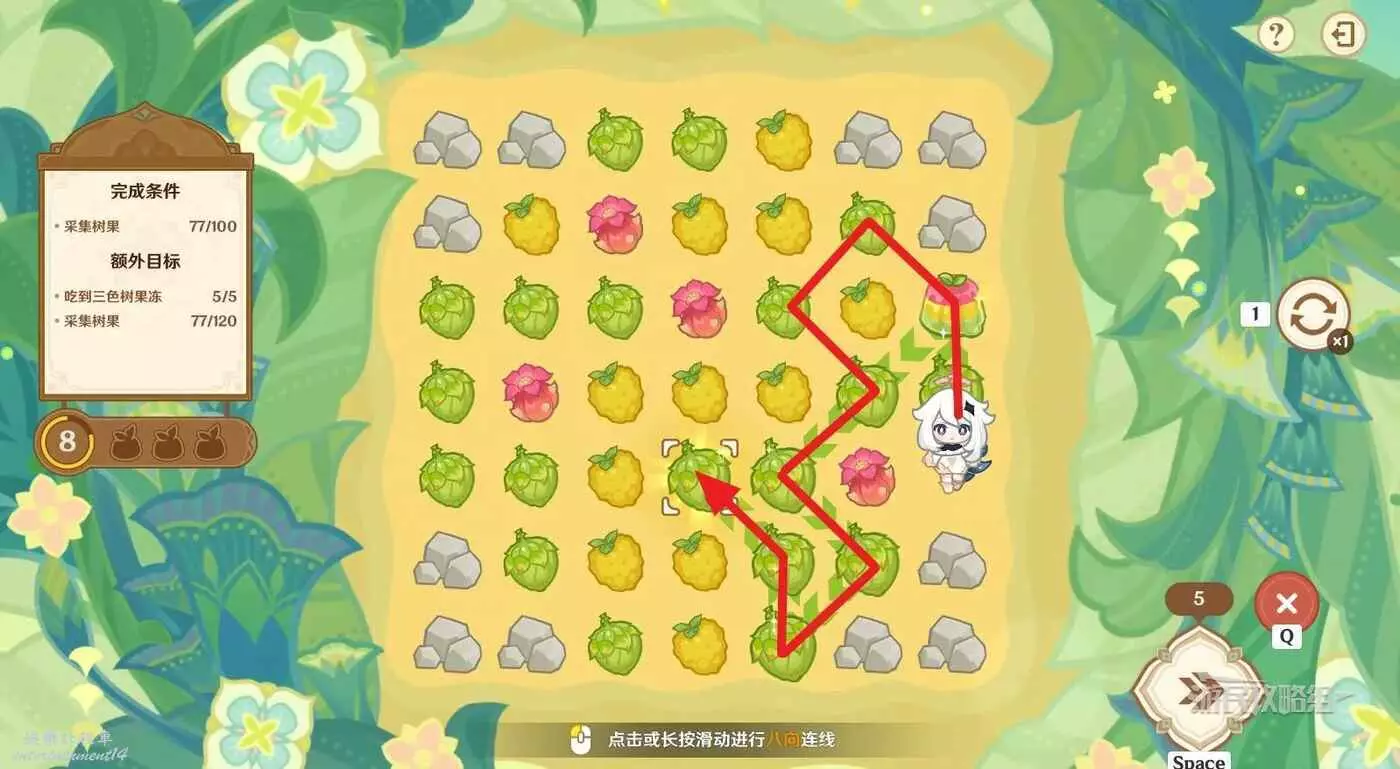 ※由於只有開局固定,後續追加的樹果顏色均為隨機,因此本文僅提供滿獎勵通關思路,答案不唯一。完成目標之後可以提前結束關卡,記得合理運用採集道具來更換不理想的板面。