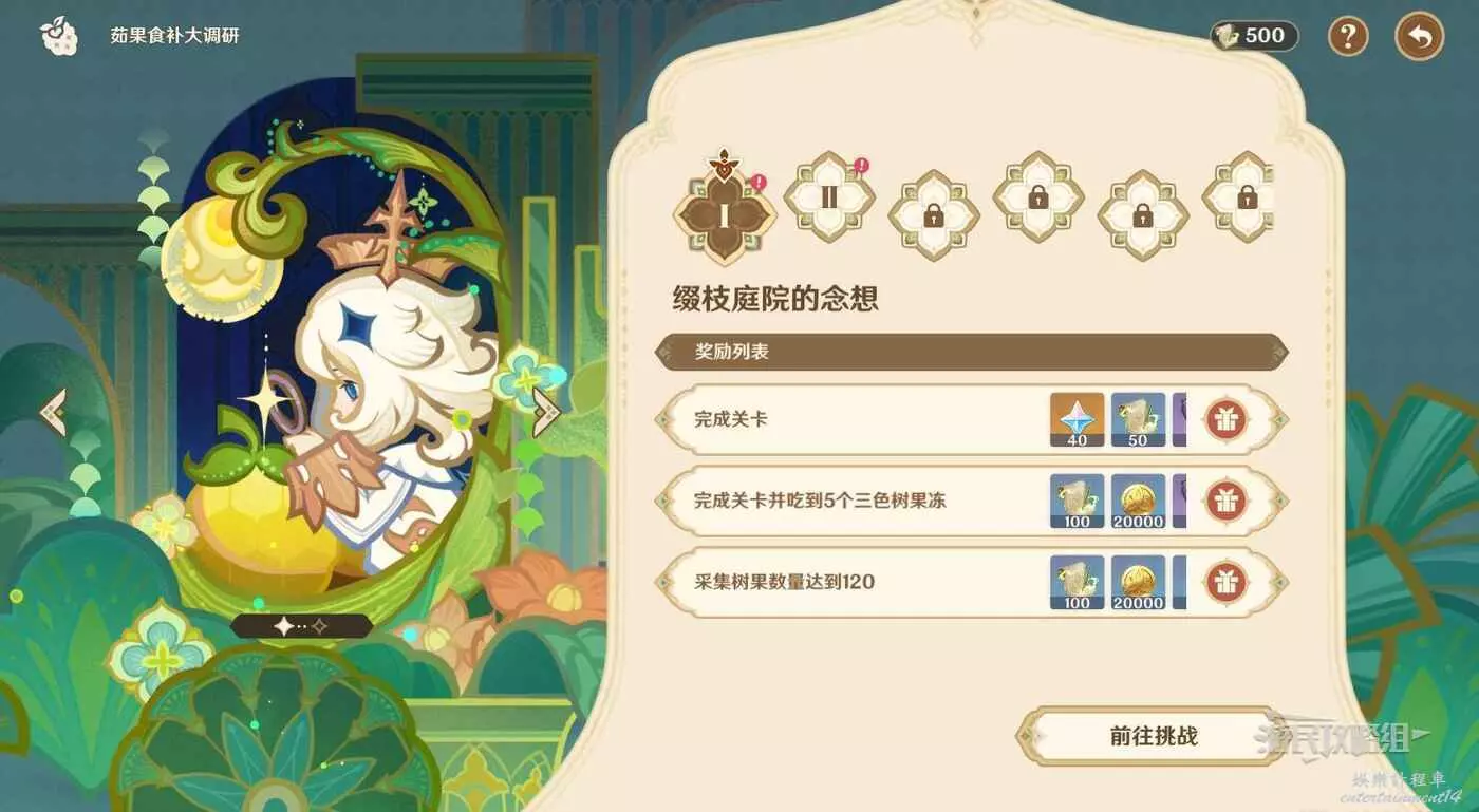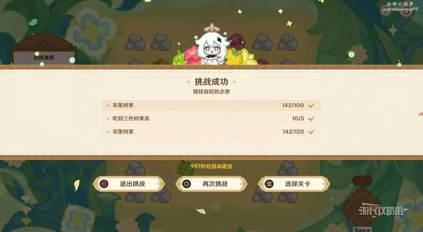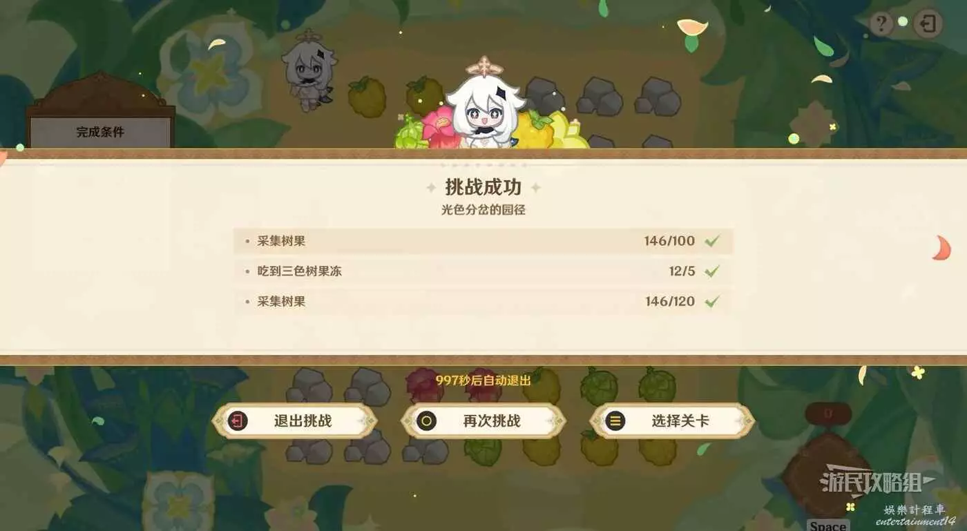 完成關卡;完成關卡並吃到5個三色樹果凍;採集樹果數量達到120