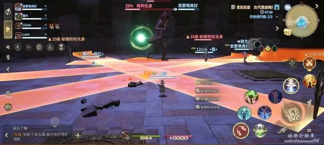 當BOSS血量降低到35%左右時,場地會按照順序重複召喚秘銀權杖化身並持續釋放直線AOE攻擊。