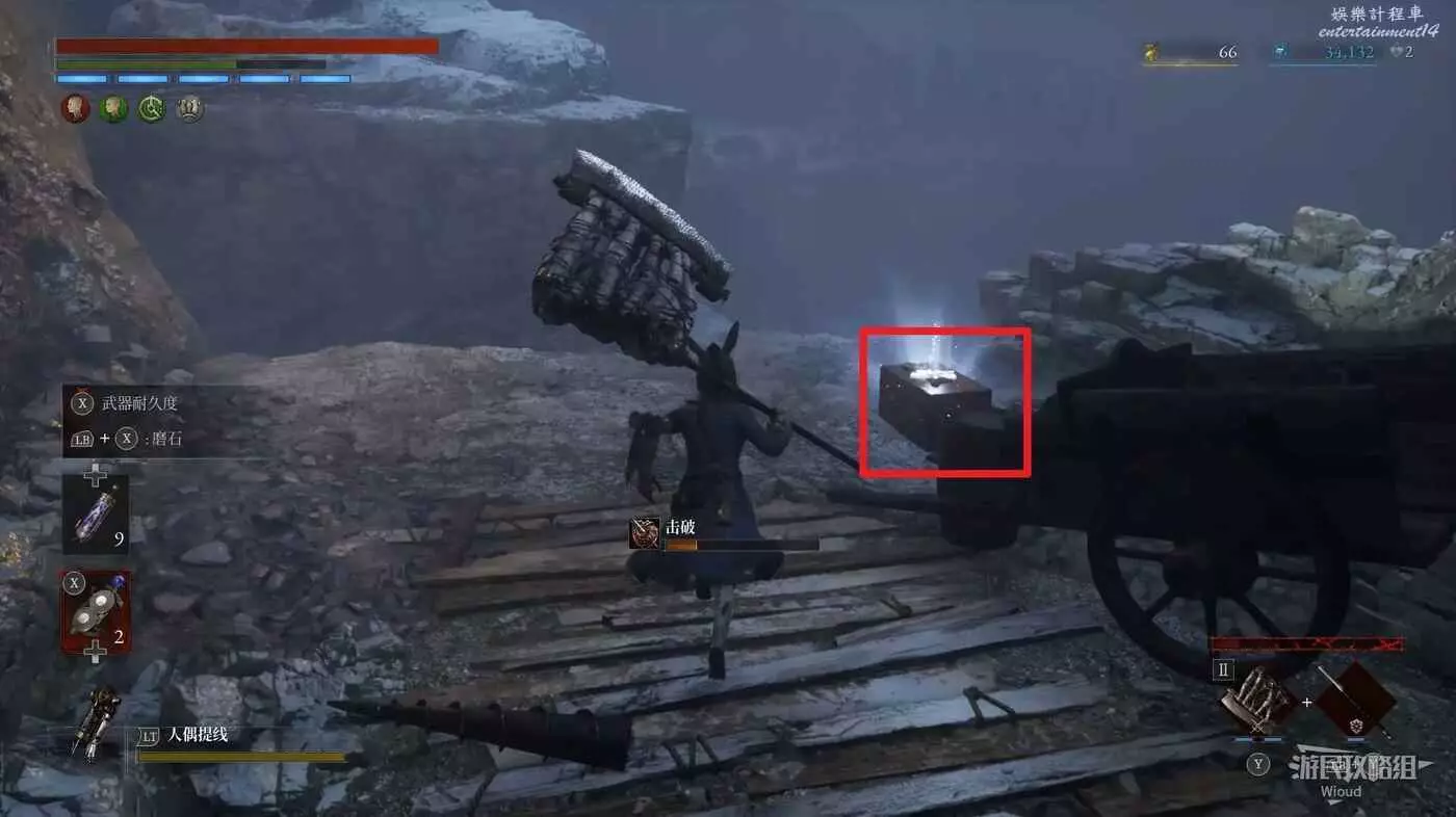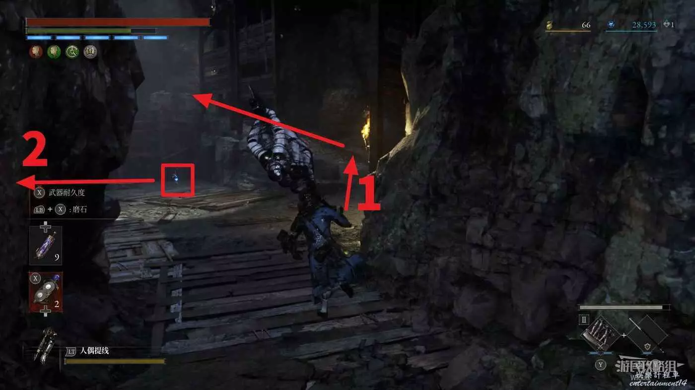 通過隧道來到第一個開闊區域,拾取前面道具,先走下圖1號路線,穿過一段木橋走到頭可找到一個寶箱,獲得【古老圓盤】。