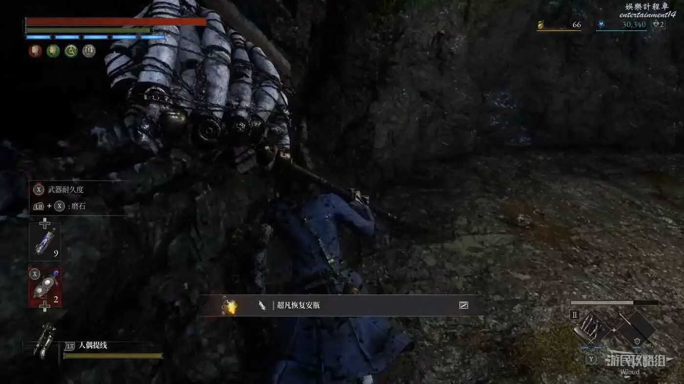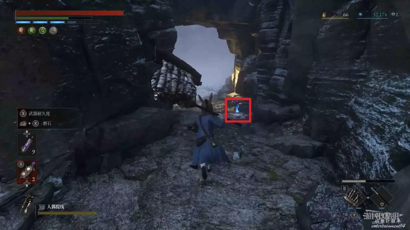 邊緣往下看,跳到中間有燈光的平台身上,裡面擊敗一個敵人,可拾取到【超凡恢復安瓶】與一堆道具。