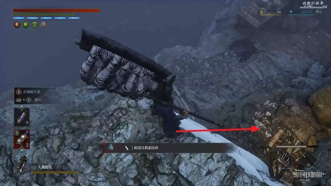 回到開闊區域走左邊2號路線,後面分出了上下兩條路,走右邊朝上的路,盡頭拾取一個自我素結塊。