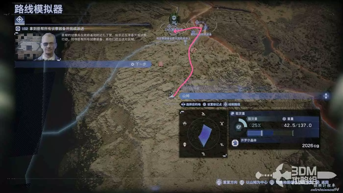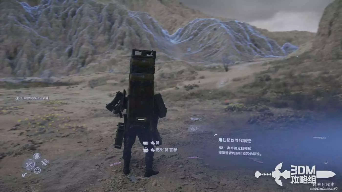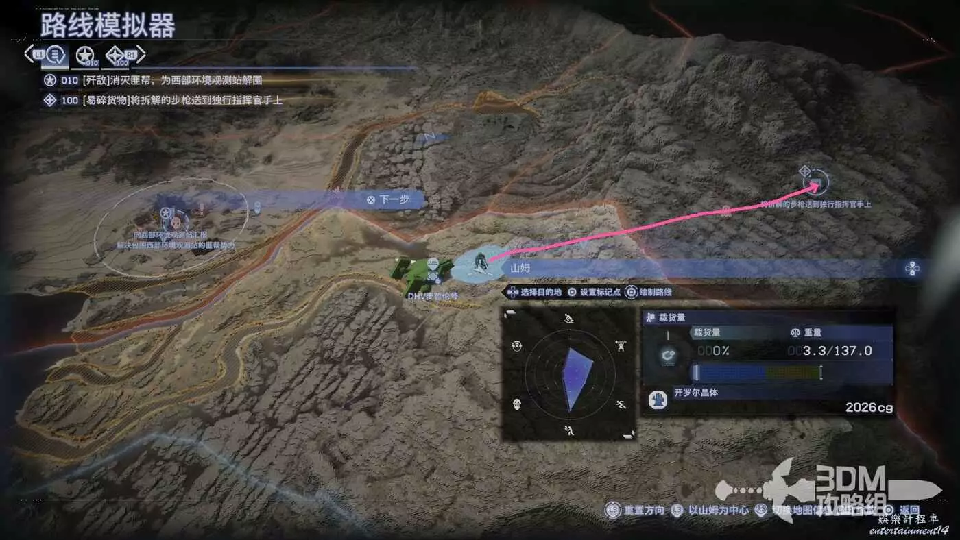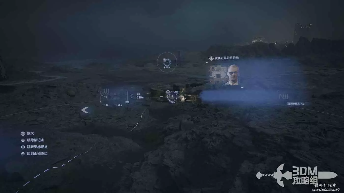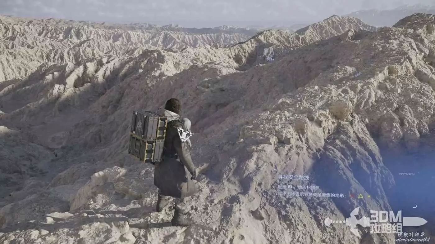 剛才我們在地圖上標記了路線,現在按L1掃描也會顯示出路線,附近的遺失貨物也能被發現,遺失貨物是用來增加我們訂單完成的分數的,不過也不是強制的。