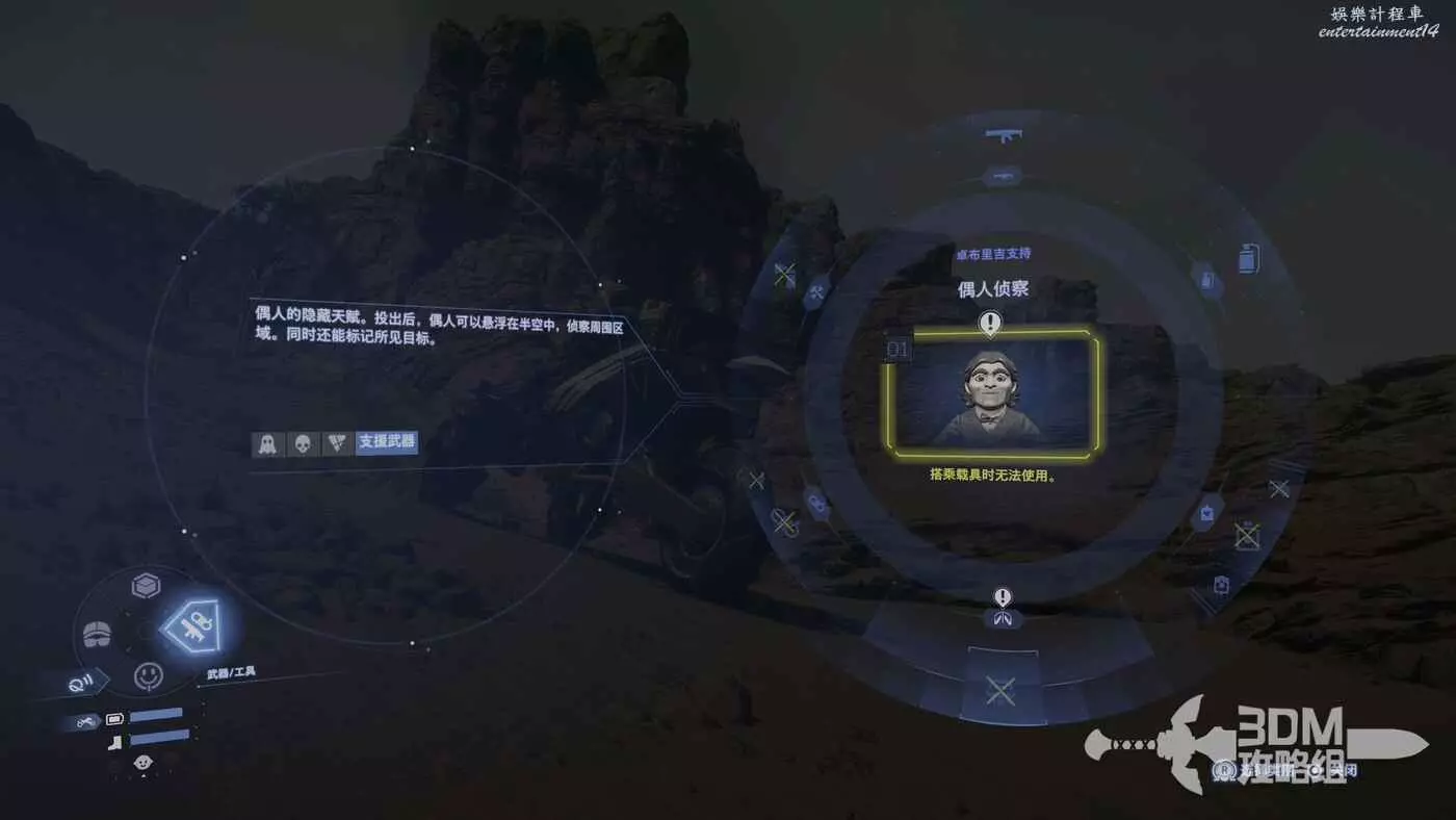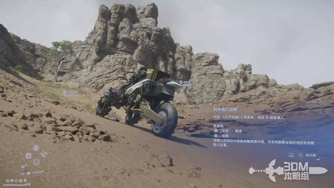 選擇下方的偶人裝備可以切出來幫我們偵查。裝備後長按L2可以瞄準,按R2投擲,和扔其他的道具一樣的用法,其實偶人就是一個不需要建造,無次數使用的瞭望台,只是沒有瞭望台那麼遠那麼清晰。