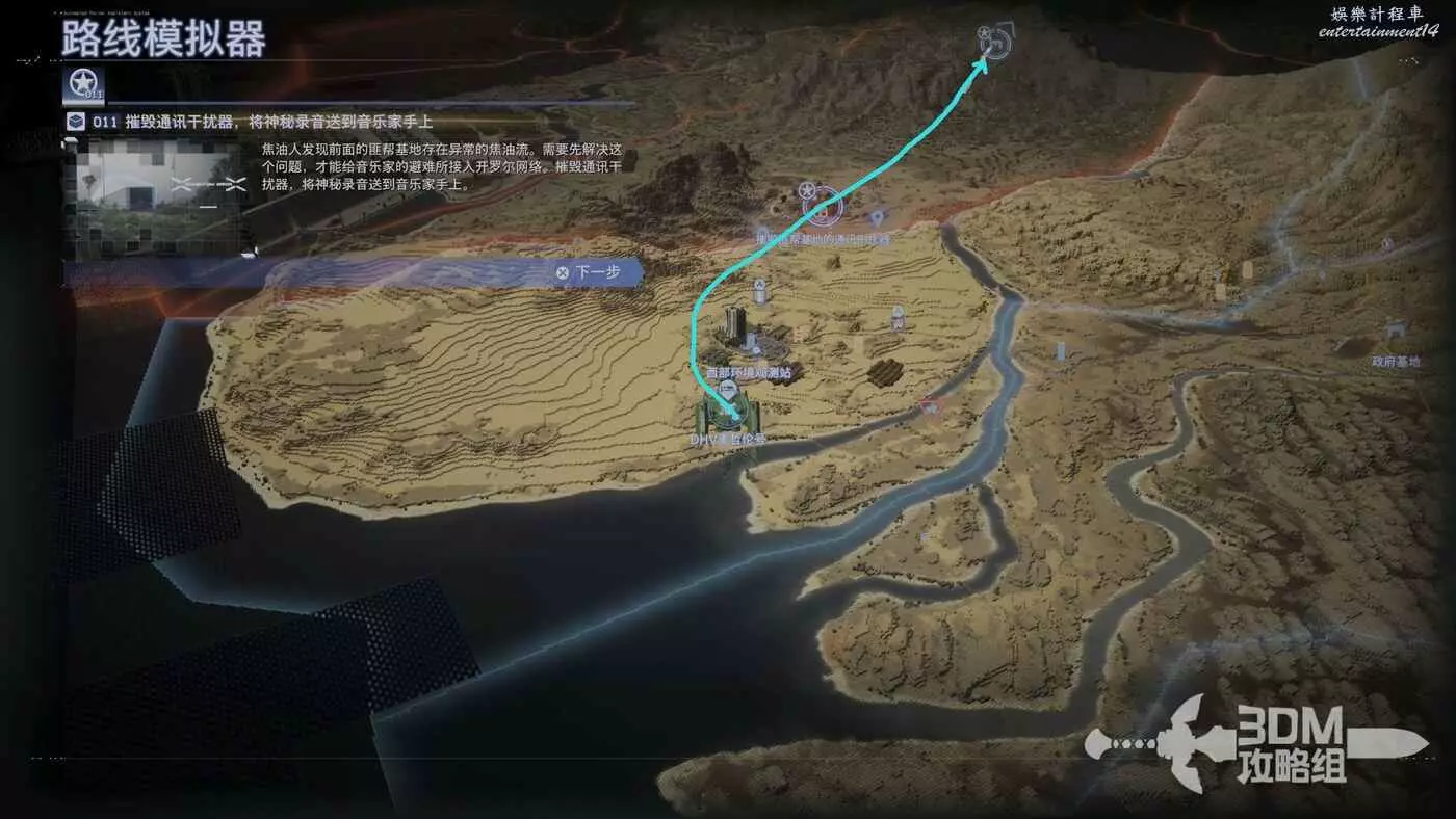 這次還是兩個目標點,先去摧毀通訊干擾器,然後把東西送到音樂家手上,路線也比較平坦,直走都行。