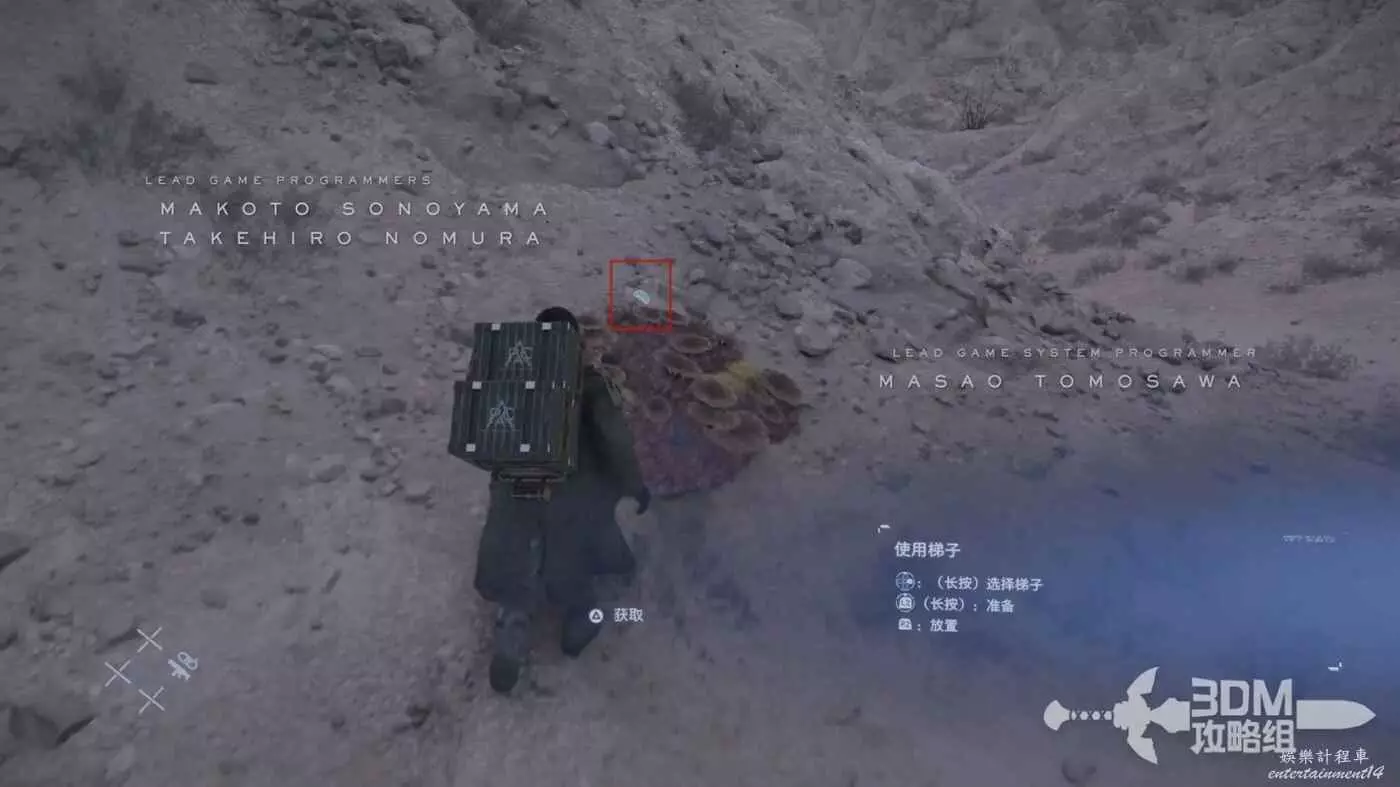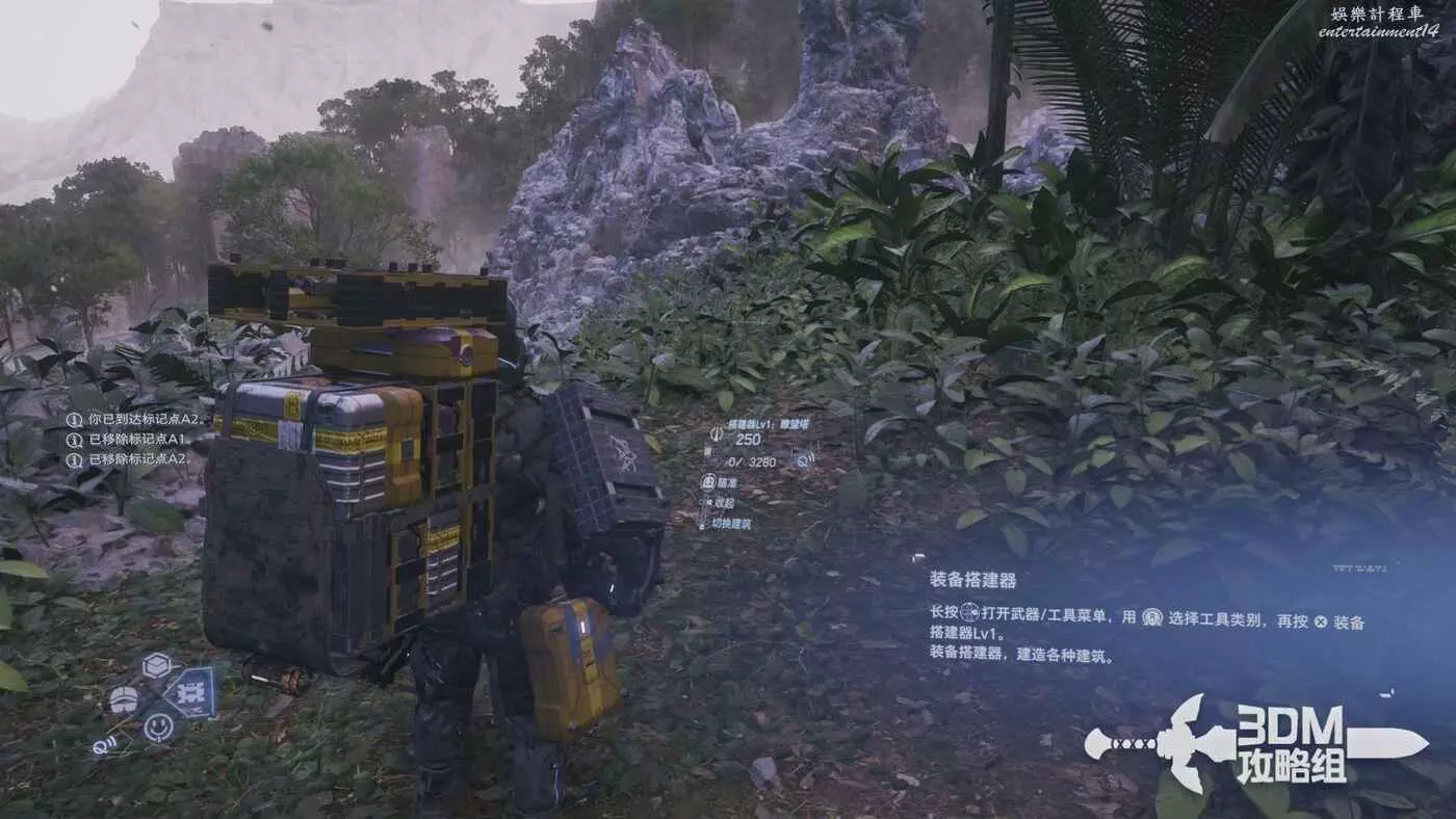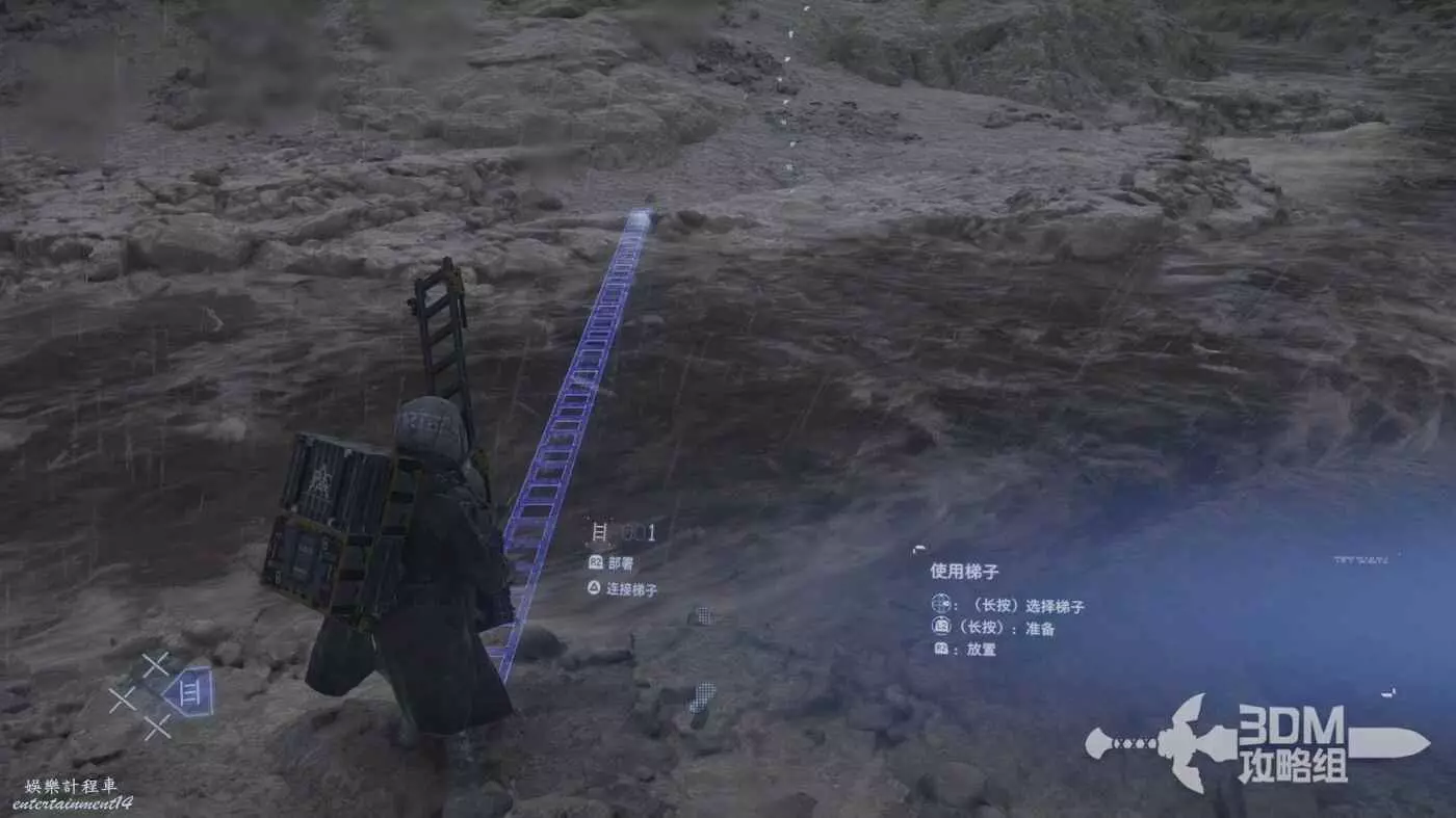 路上有不少的貨物可以撿,比如工具梯子,我們可以長按十字鍵的右鍵選擇梯子拿出來按L2鍵準備,選好位置後按R2放置。