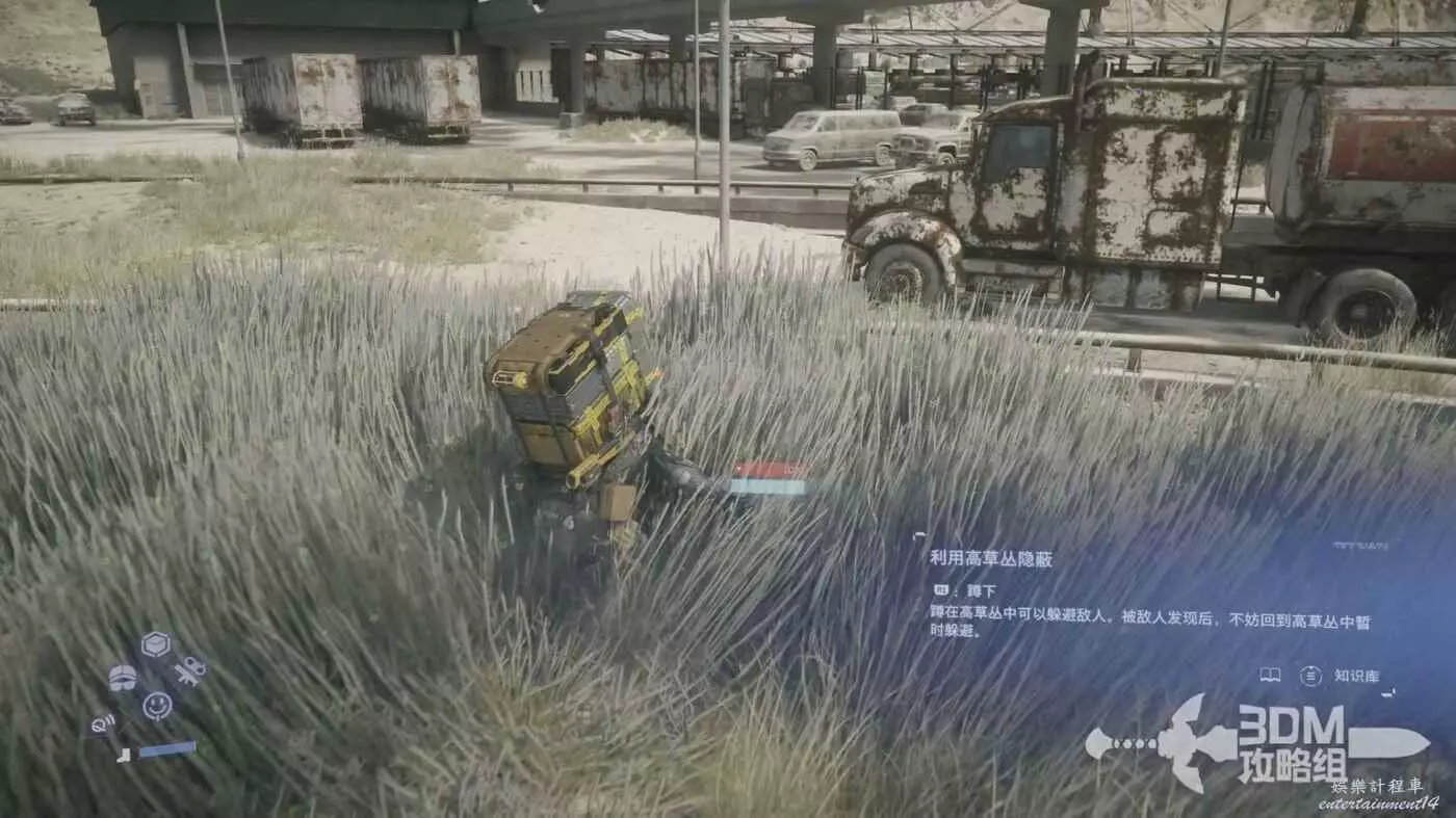 有些比較分散的敵人也會在別處巡邏,我們經過草叢也會有教學,可以按R1在草叢蹲下,防止被發現,比較隱蔽的地方草上會顯示綠色。