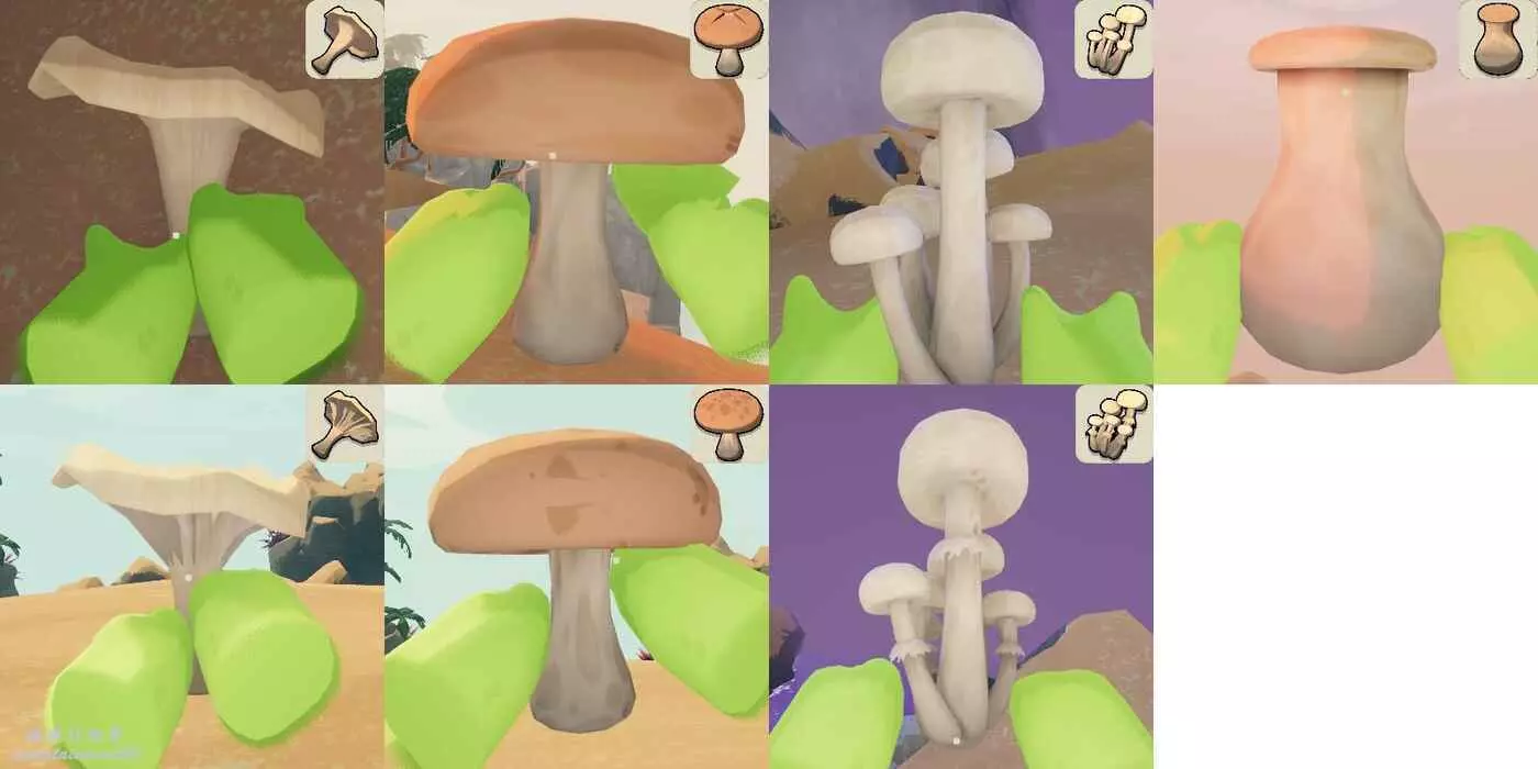 目前遊戲中有4種蘑菇,下圖上面的4個是無毒菇,下面3種是有毒菇,或許最後一個也有有毒種,但是目前沒見過。