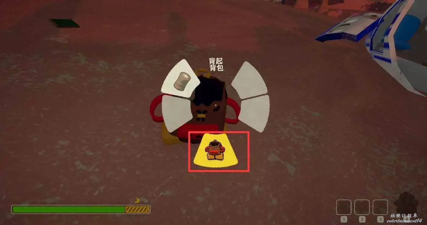 遊戲裡背包操作比較怪,想要背起背包首先長按E,然後用滑鼠瞄準下面這個紅框的位置,發黃後鬆開E,就成功背上了背包。