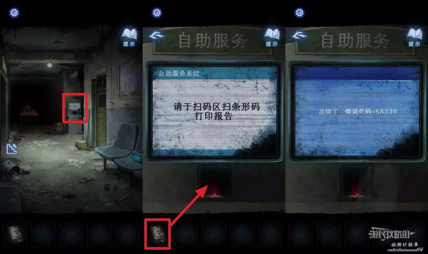 點擊走廊裡的自助服務機,選擇道具欄中的【憑條】放在掃碼區掃碼,獲得錯誤代碼【58339】。