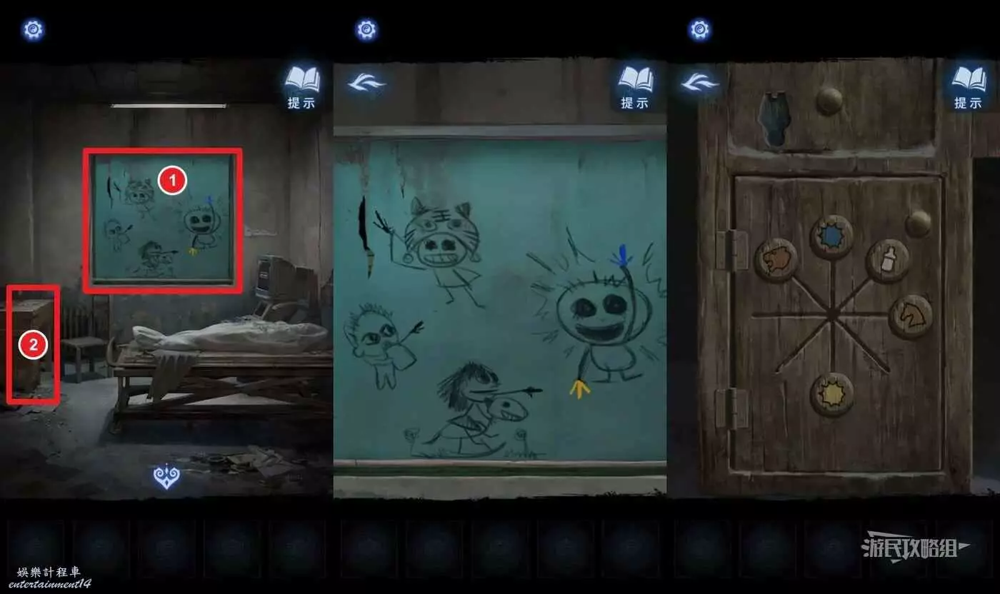 進屋之後掀開簾子(有布娃娃小高能),前方玻璃上是解謎線索,記住奶嘴、藍色箭頭、黃色箭頭、馬頭和虎頭小孩所指方向,然後點擊房間左側的木櫃子,將對應的按鈕移動到正確位置,打開櫃子。