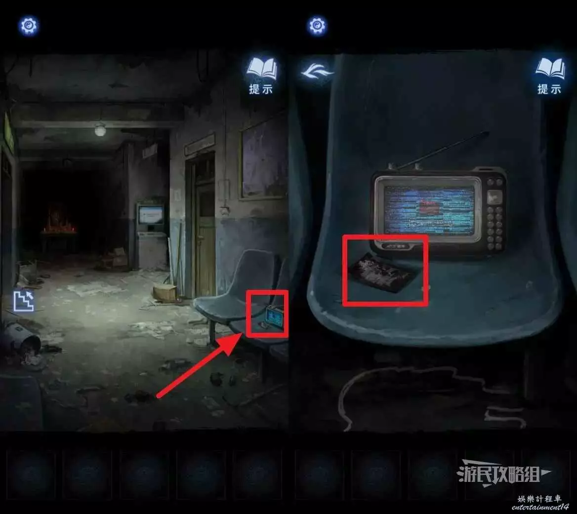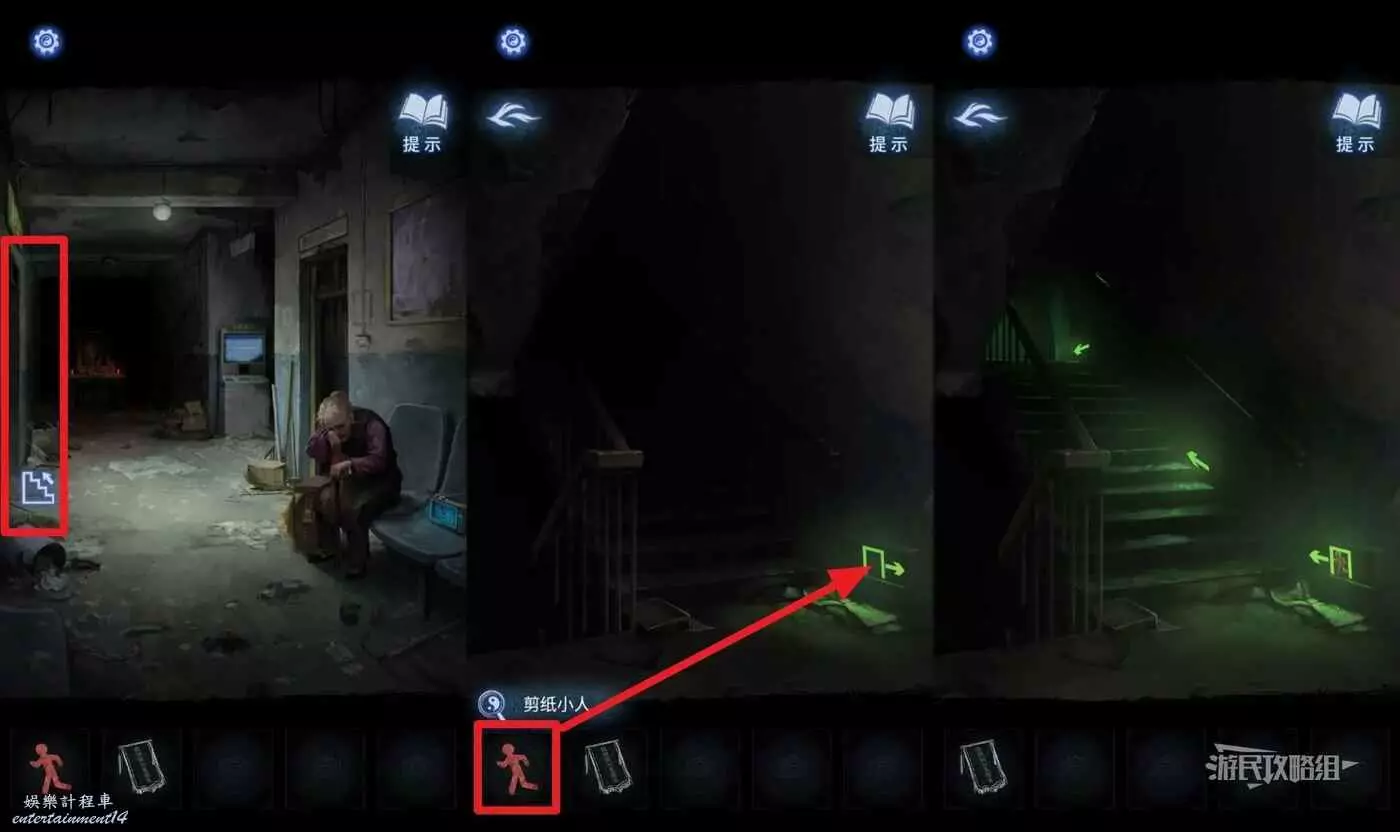 返回屋外的走廊,觀看劇情。看完劇情後,點擊走廊左側的樓梯標誌,選擇道具欄中的【剪紙小人】,將小人放在牆底部的安全出口標誌上,解鎖二樓。