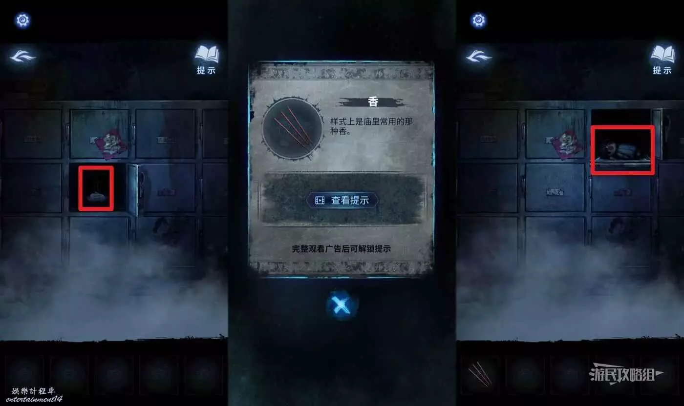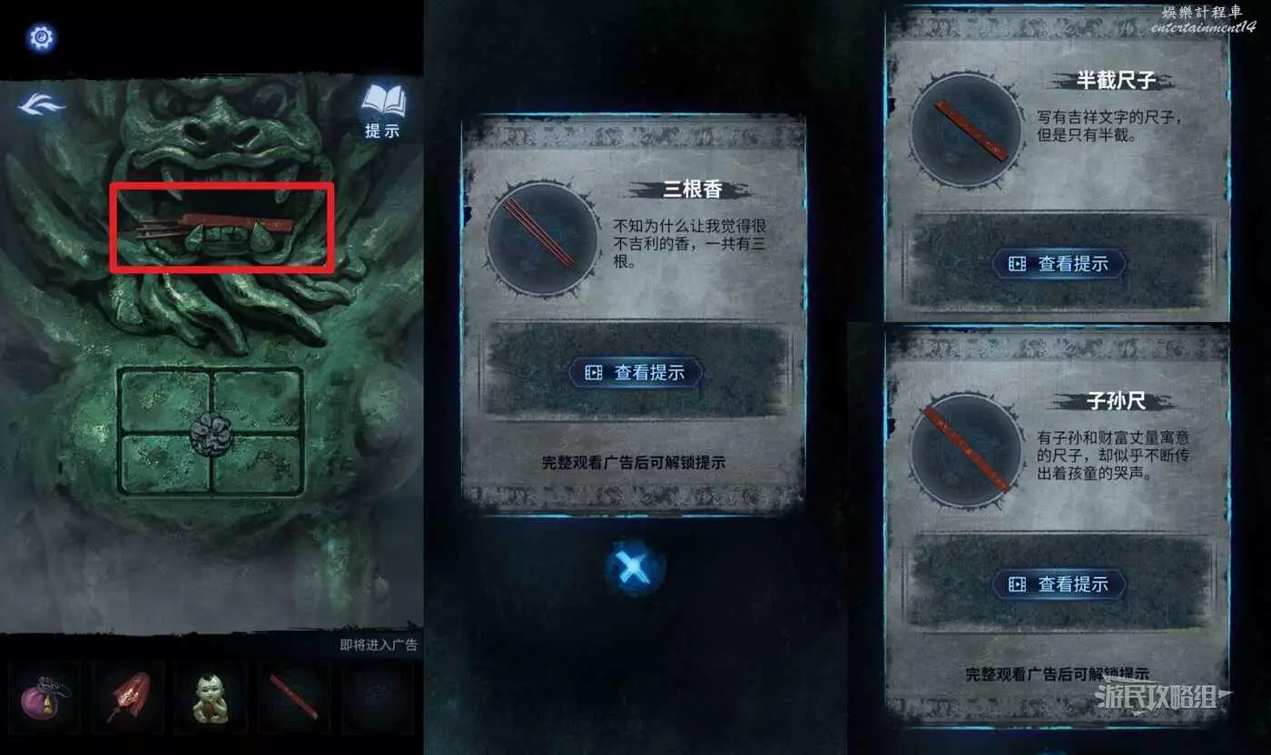 按照正確的順序移動按鈕後,拾取【三根香】和【半截尺子】,和之前的半截尺子自動合成【子孫尺】。