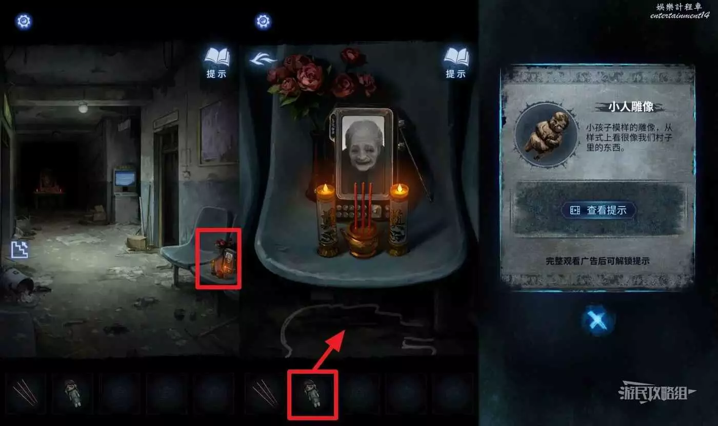 拿到布娃娃之後回到一樓,點擊椅子上的靈位,選擇道具欄中的【布娃娃】放在靈位下方,獲得【小人雕像】。