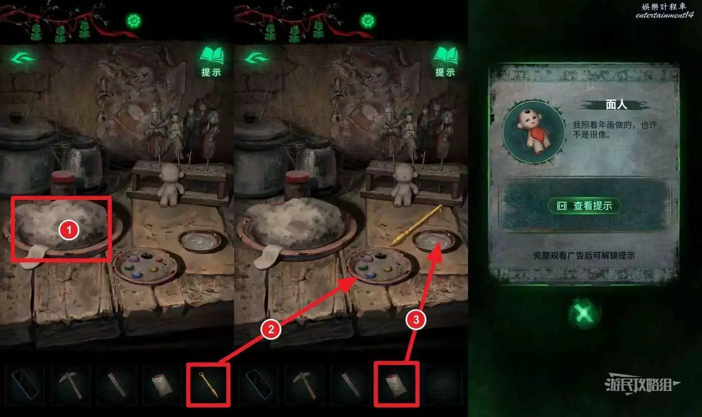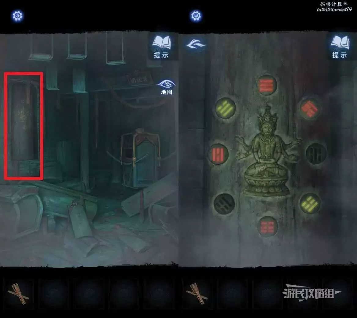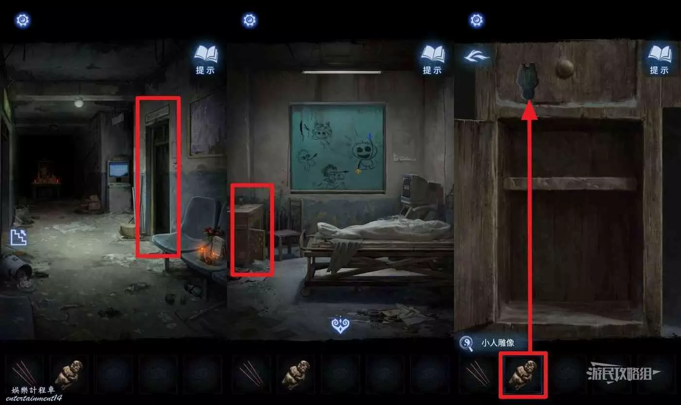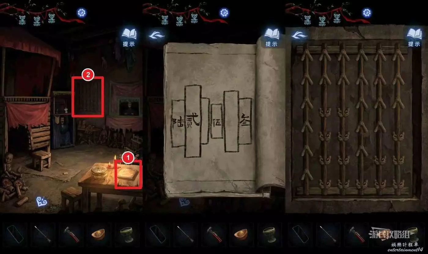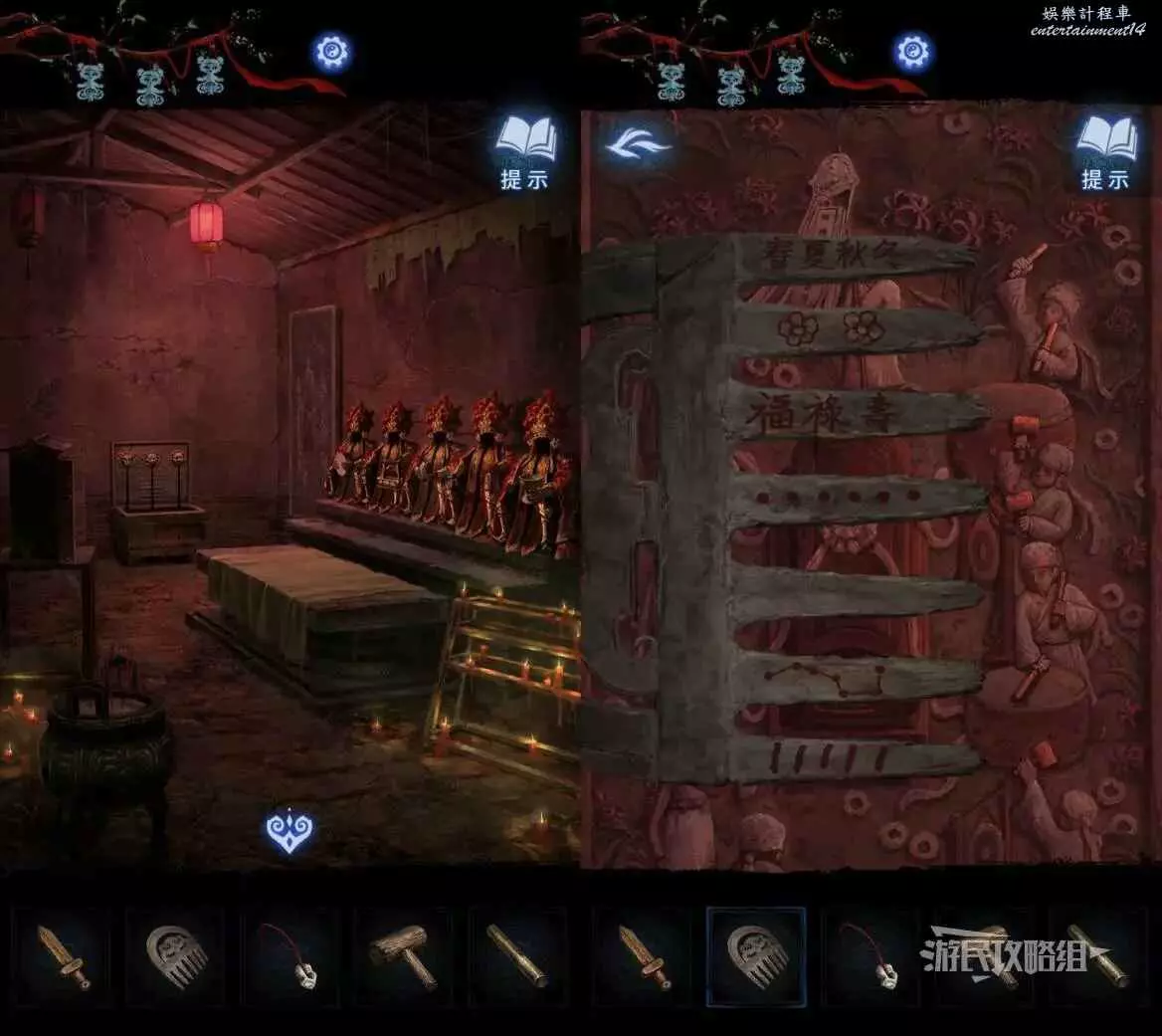 完成小遊戲後,點擊中間下方的桌子。這裡會用到最初在紙人廟左側窗戶外的木牌上的線索,正確放置5個雕像和1個字。