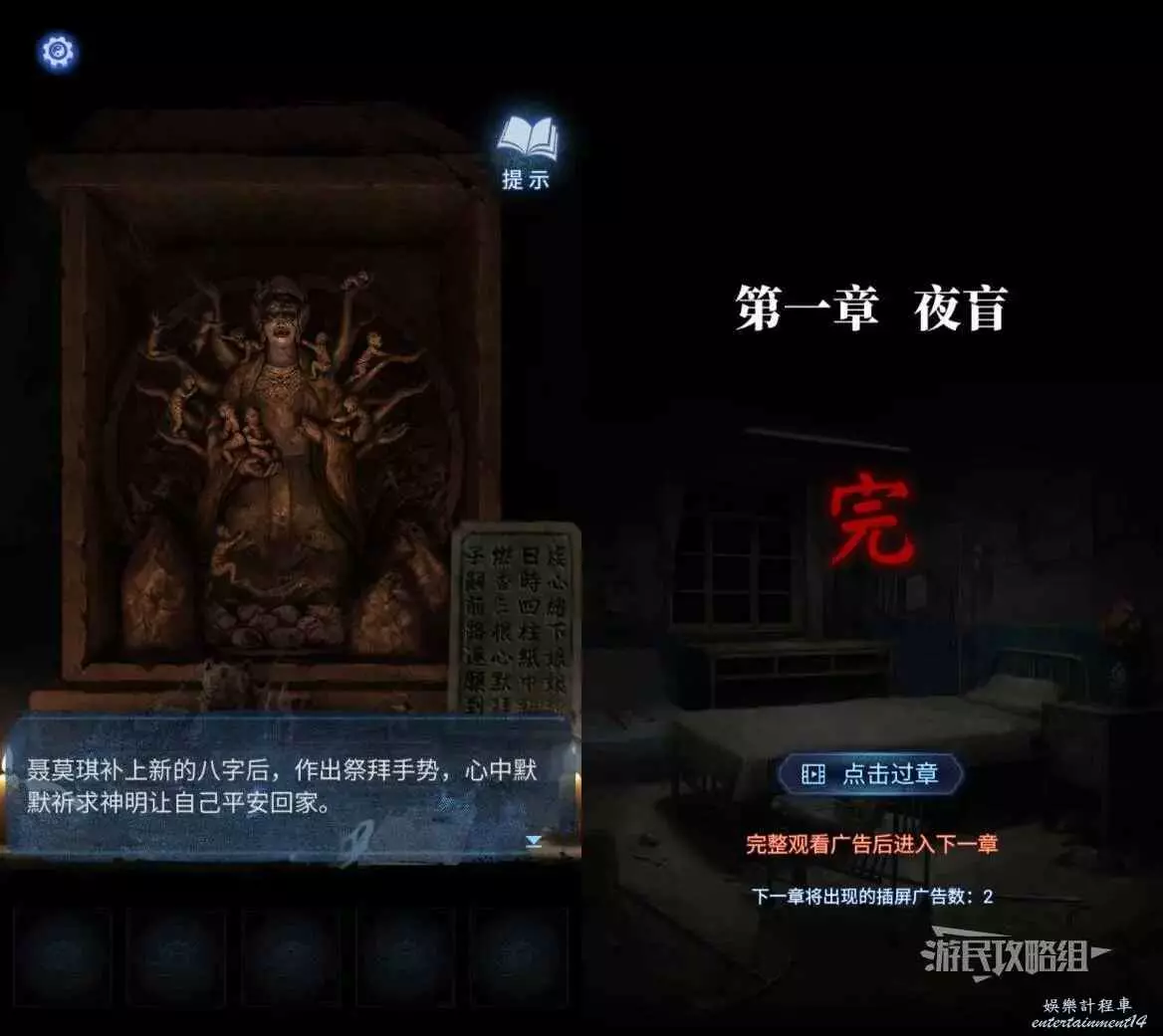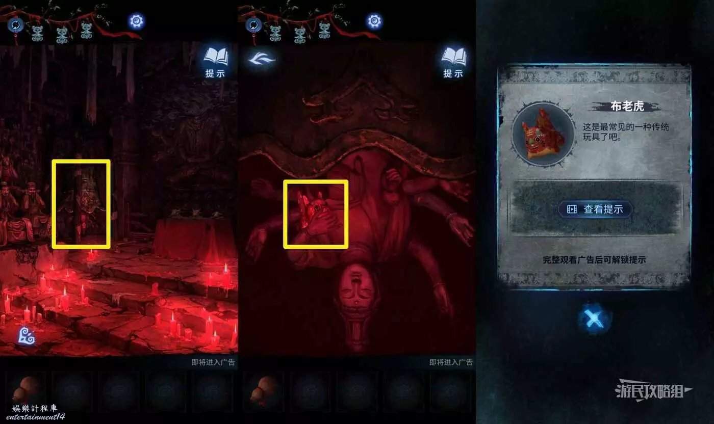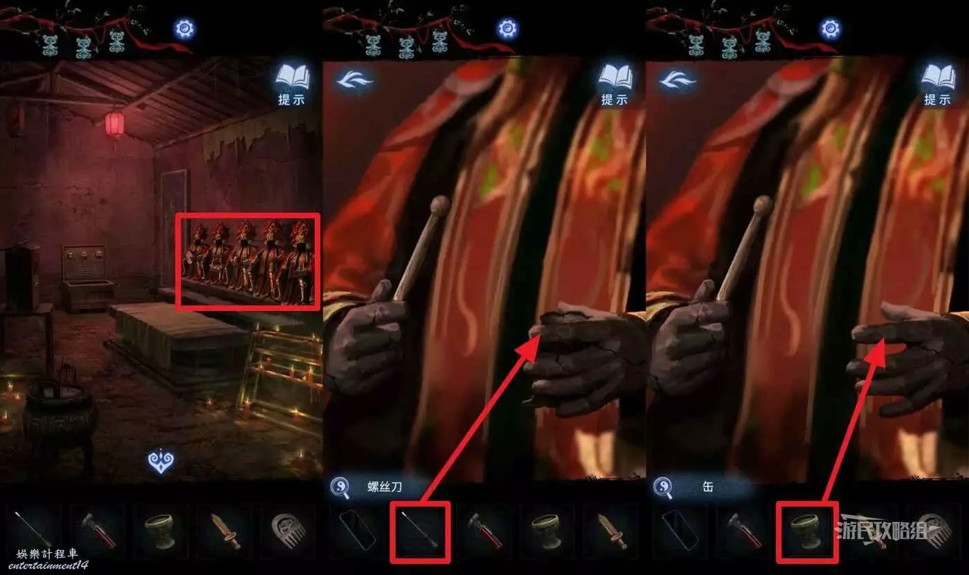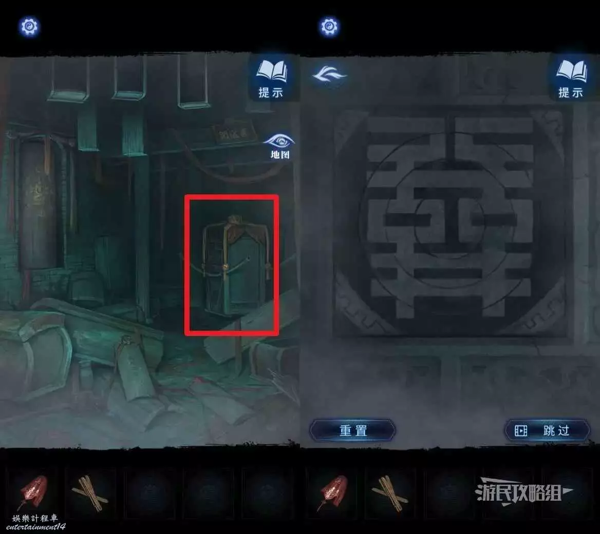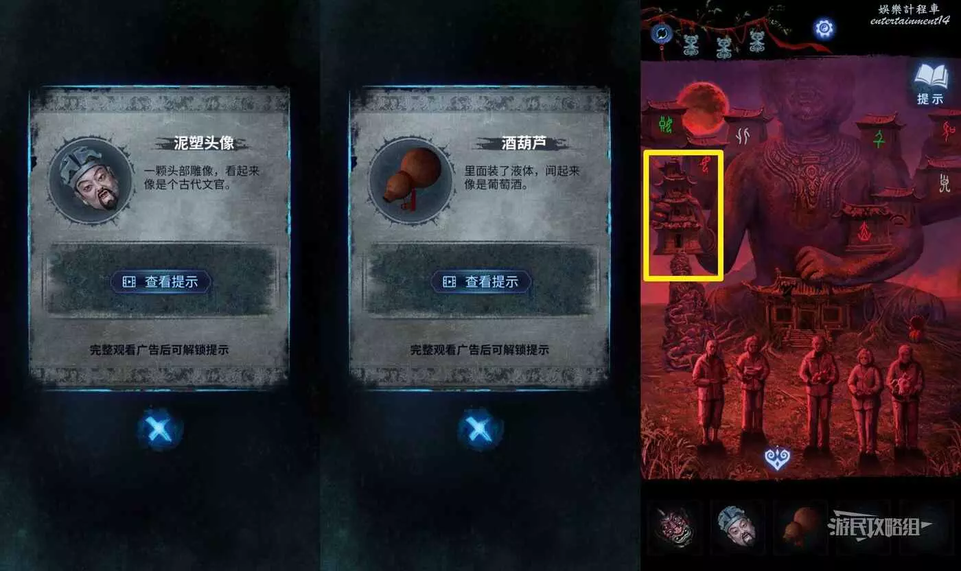 完成小遊戲後,點擊中間下方的桌子。這裡會用到最初在紙人廟左側窗戶外的木牌上的線索,正確放置5個雕像和1個字。