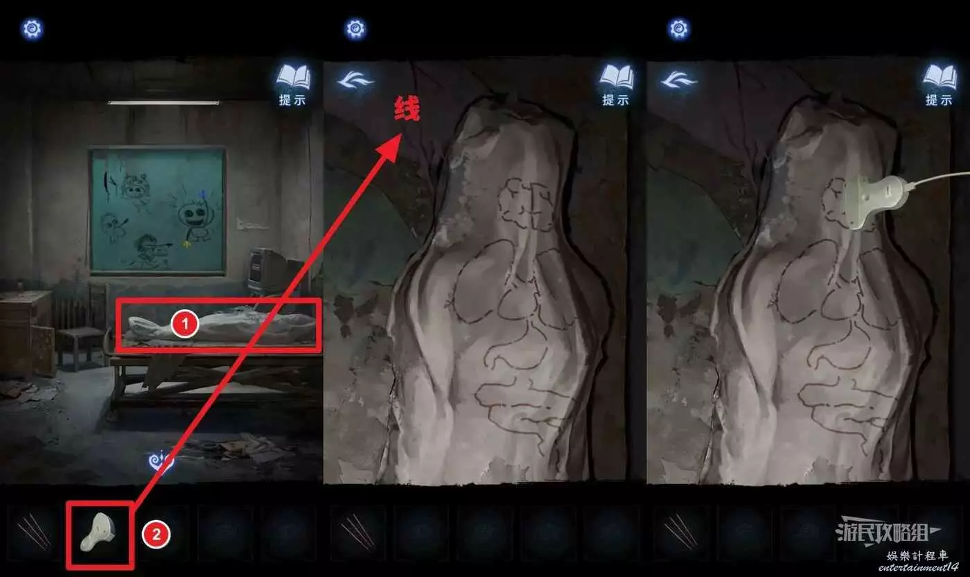 進入辦公室後,點擊顯示幕右側台燈下的書拿到線索。然後點擊牆上的錦旗,將道具欄的兩個錦旗掛在牆上,在錦旗上找書上被塗黃的字,按照字的位置來排列錦旗,打開停屍櫃(有音效小高能)。