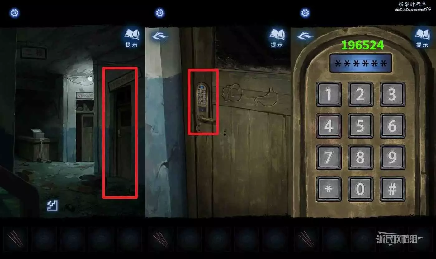 回到二樓走廊,點擊畫面最右側的門,門上可以看到腦子和胃圖案的提示,點擊密碼鎖,輸入密碼【196524】進入房間。