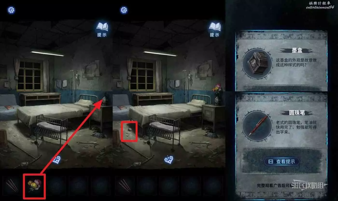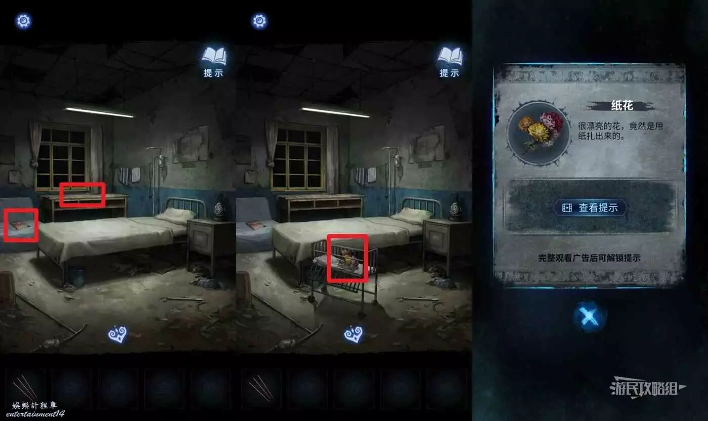 進入房間後,分別點擊桌子上的報紙和左側沙發上的雜誌(有鬼臉小高能),病房中間會出現一個嬰兒床,拾取【紙花】。