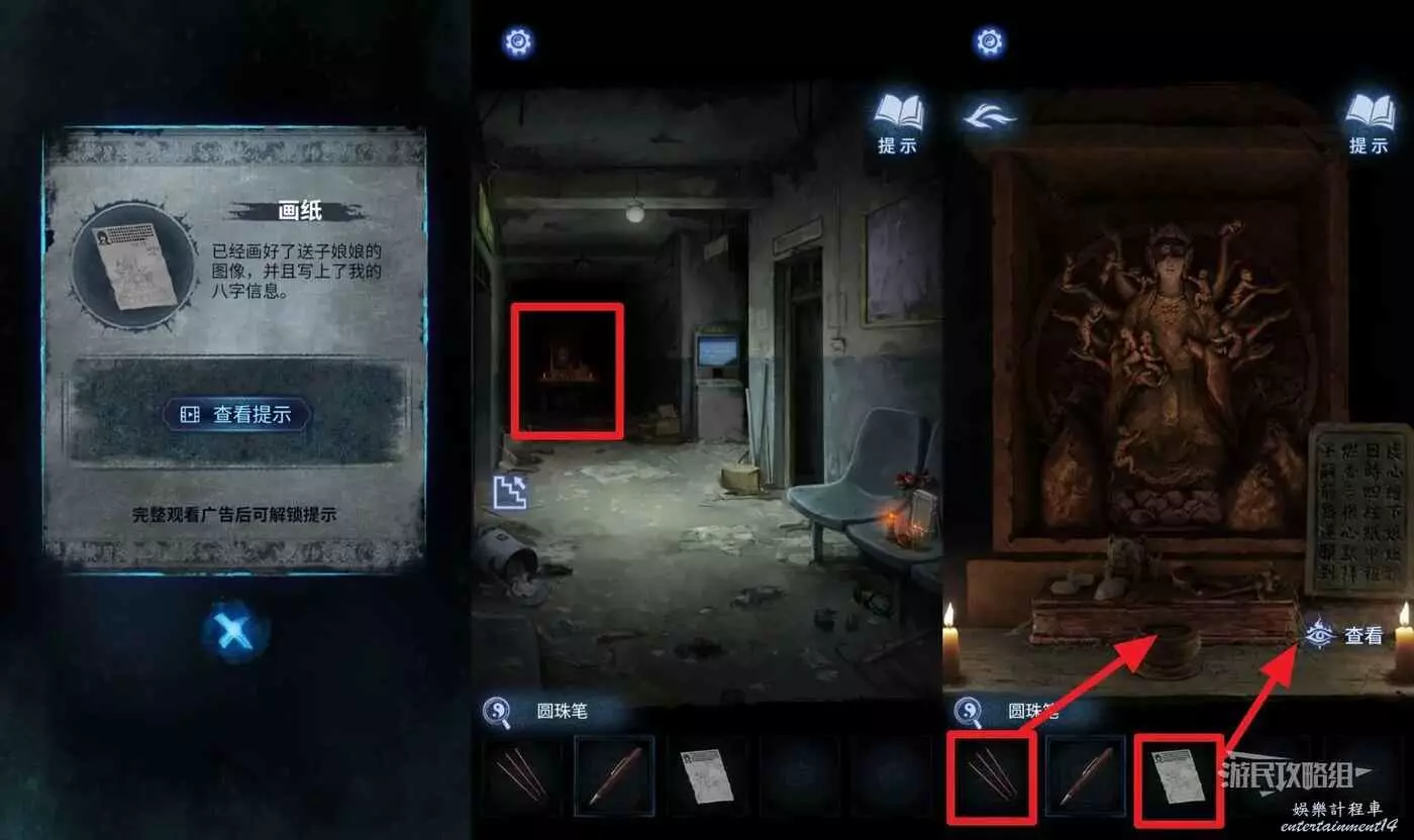 寫完八字之後,點擊拾取【畫紙】(有窗戶小高能)。回到一樓點擊走廊盡頭的雕像,將【畫紙】和【香】分別放在桌子上的對應位置(觸發音效小高能)。
