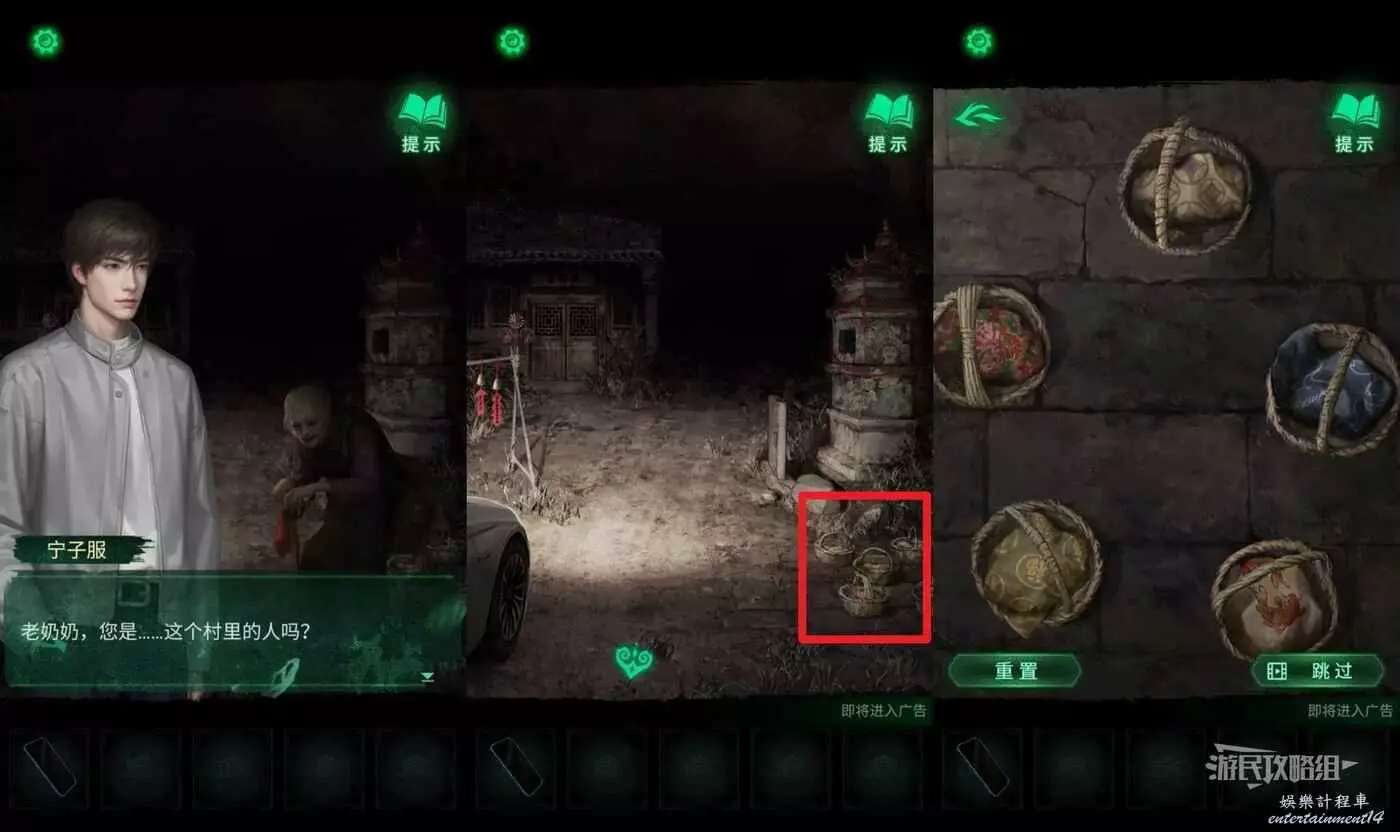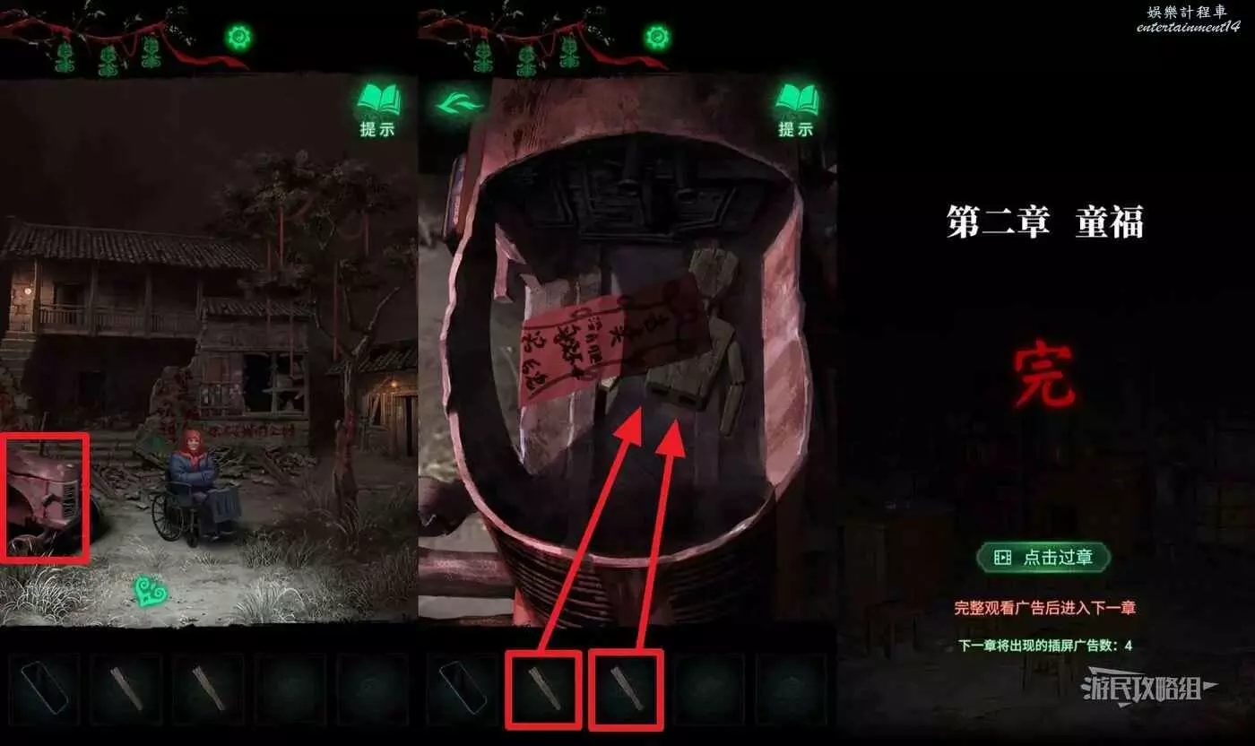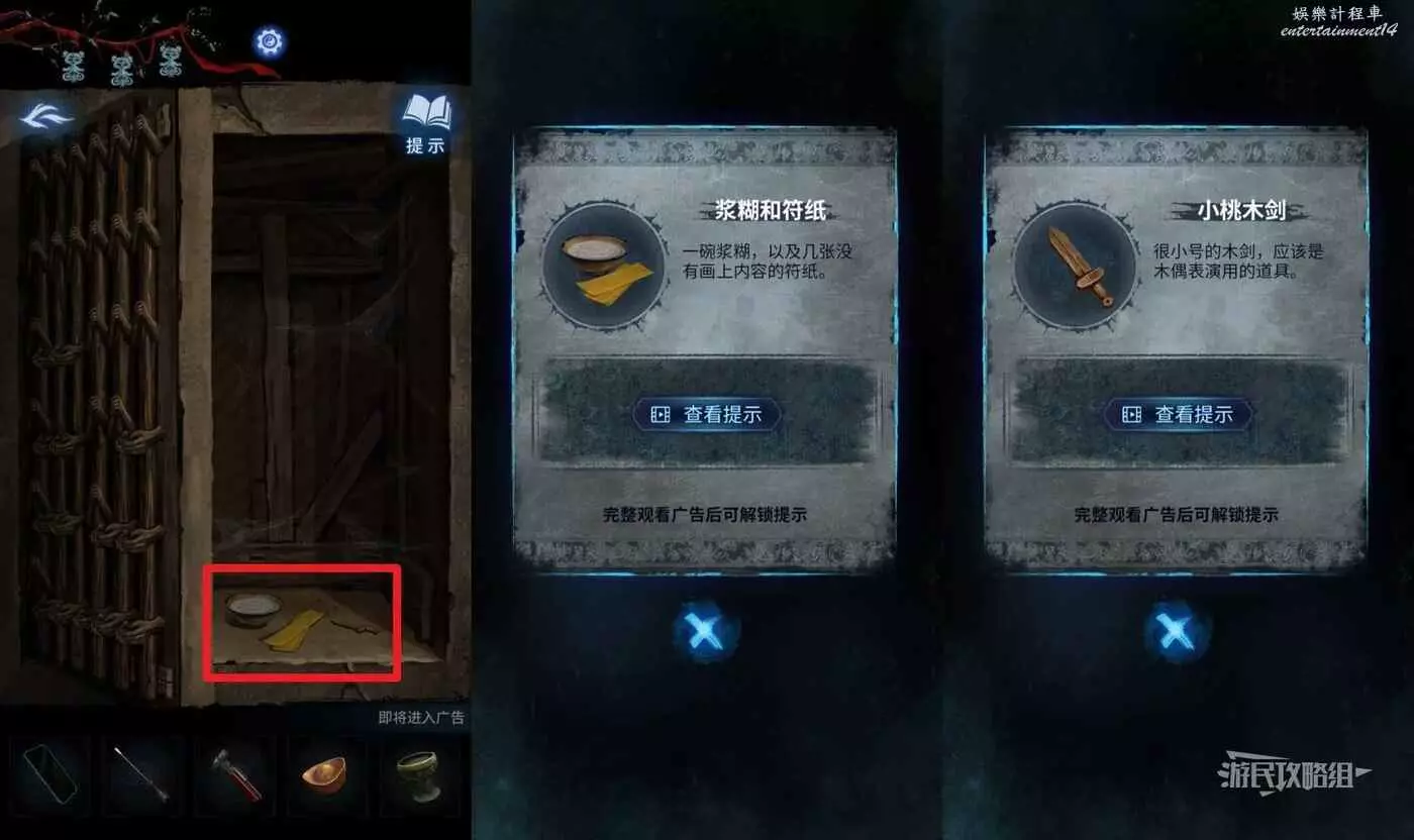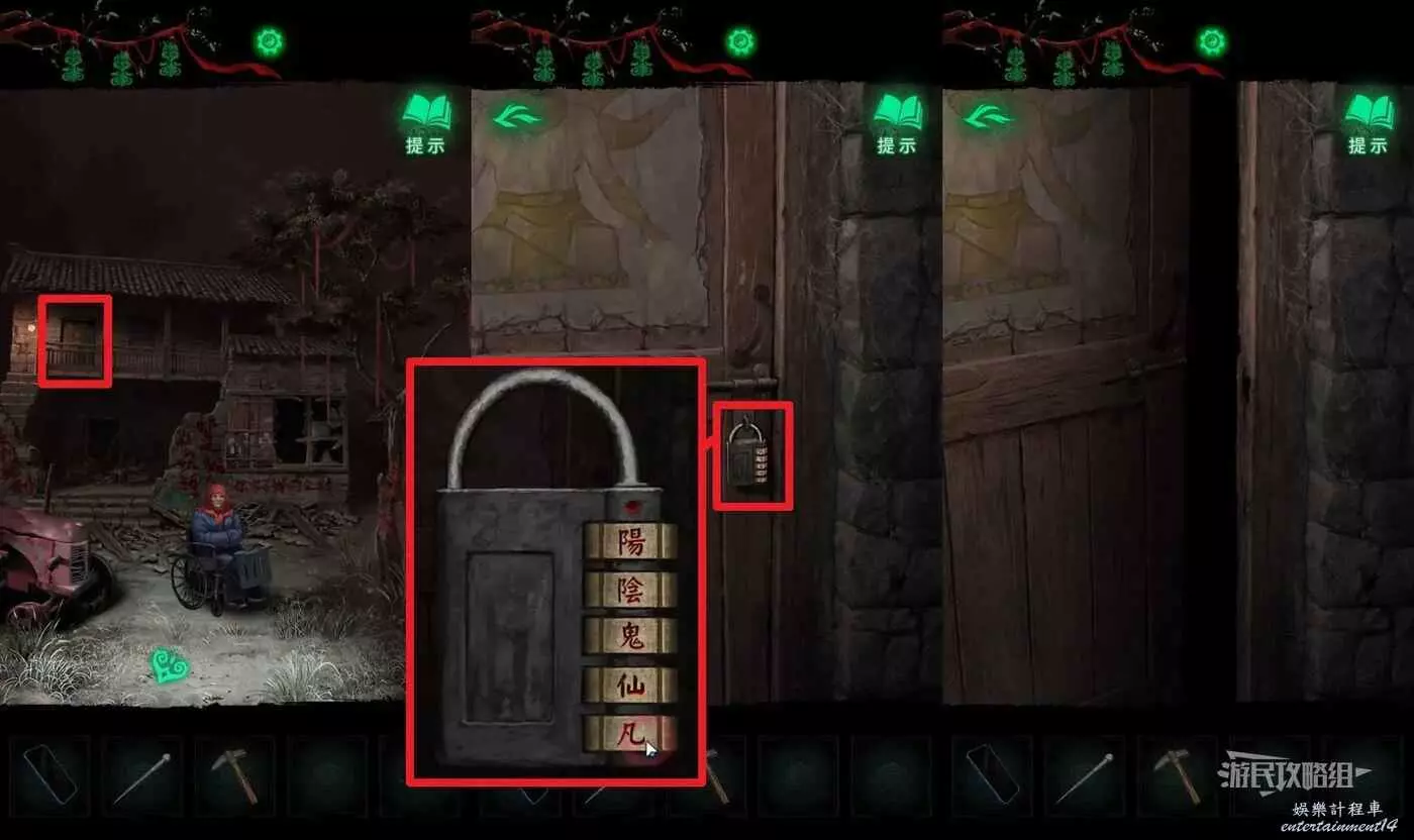 到車的另一邊進村(有小高能),觸發湯婆婆的劇情。然後點擊小賣部視窗,用手機查看小賣部視窗,可以得到線索。然後點擊介面右側的木門,在道具欄選擇【門神】貼在木門上,進門。