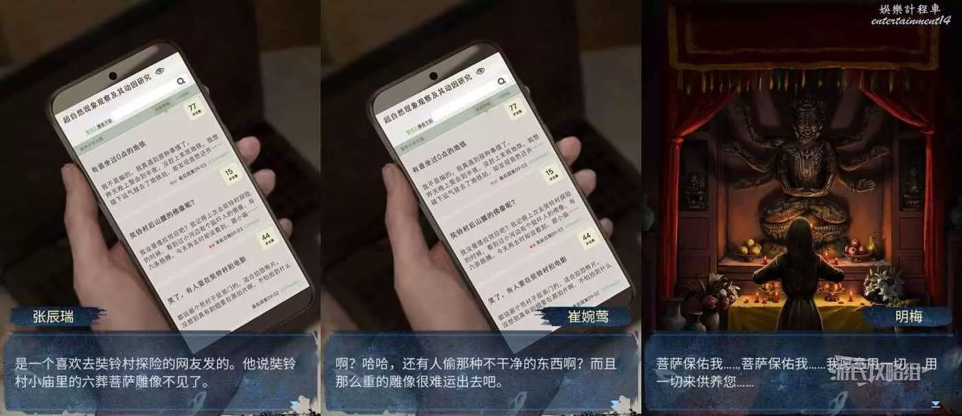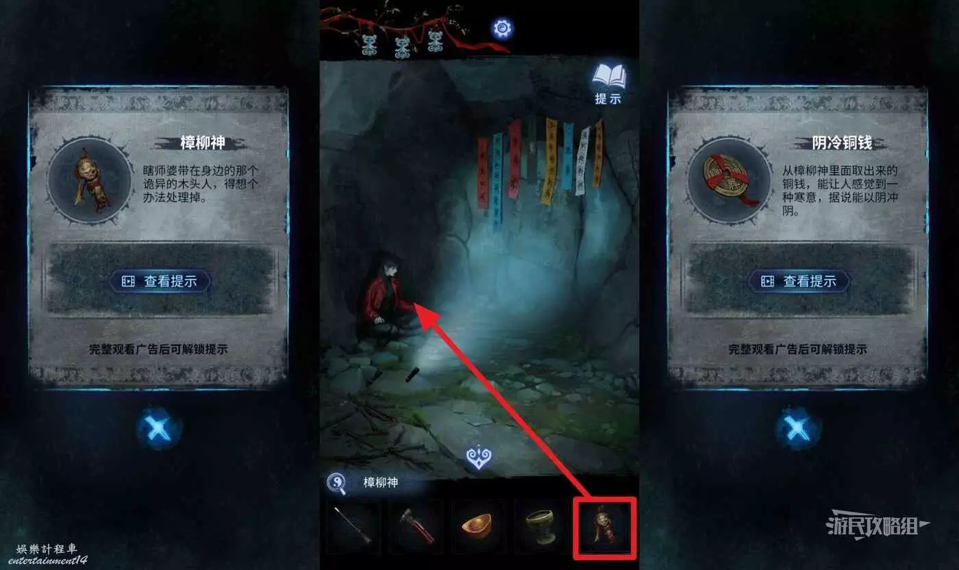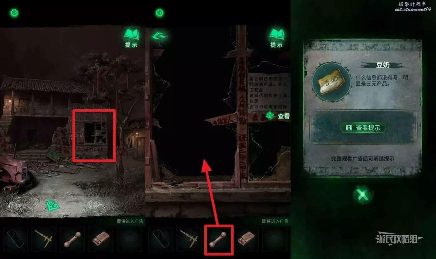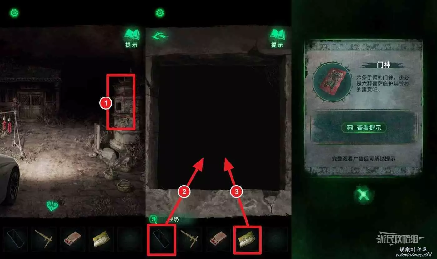回到村口,點擊右側的香爐,用手機照香爐內部(有小高能),然後把豆奶扔進缺口,獲得【門神】。