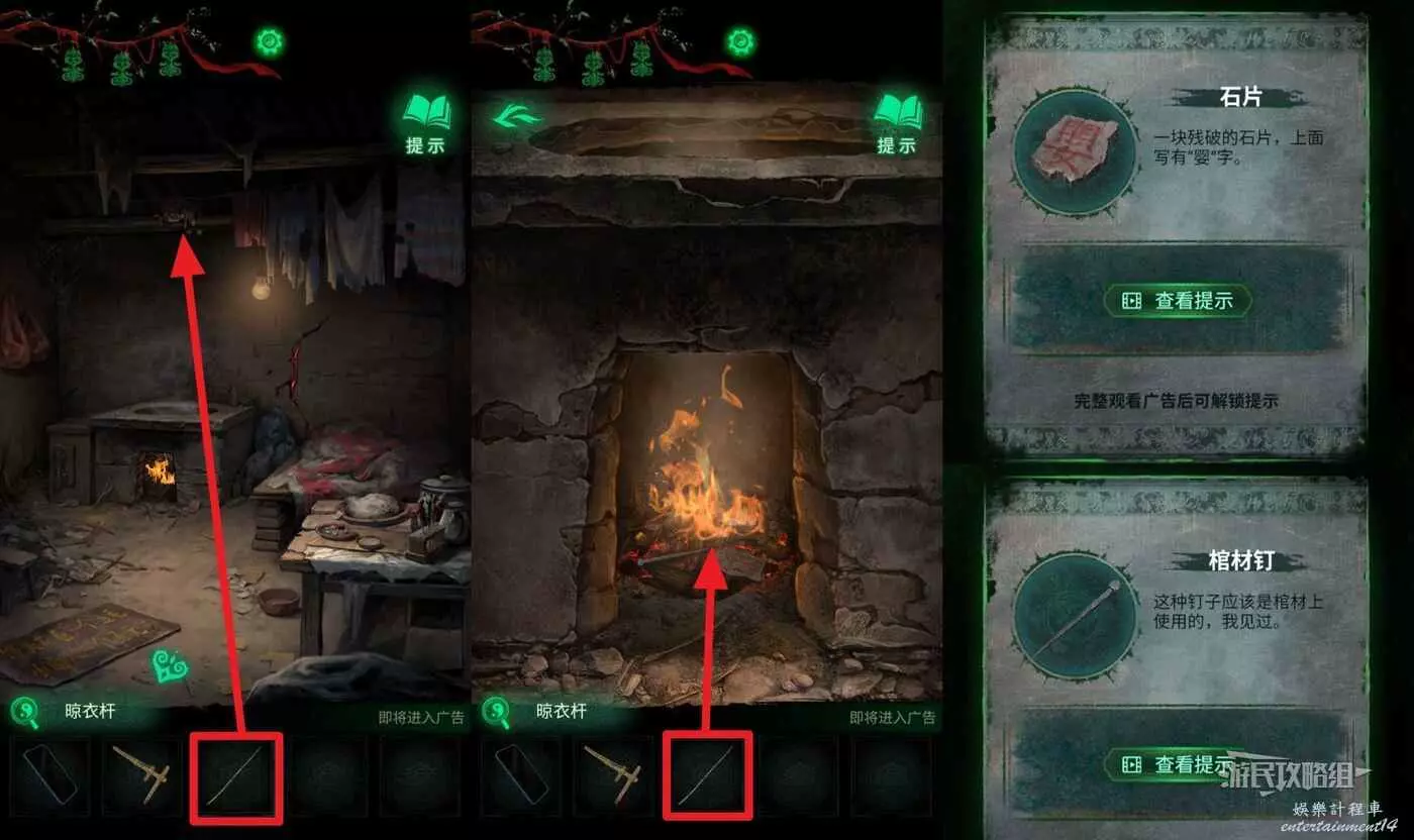 然後在道具欄中選擇【晾衣杆】,再點擊灶台正上方房梁上的布娃娃(有小高能),使用晾衣杆點擊爐火,獲得【石片】和【棺材釘】。