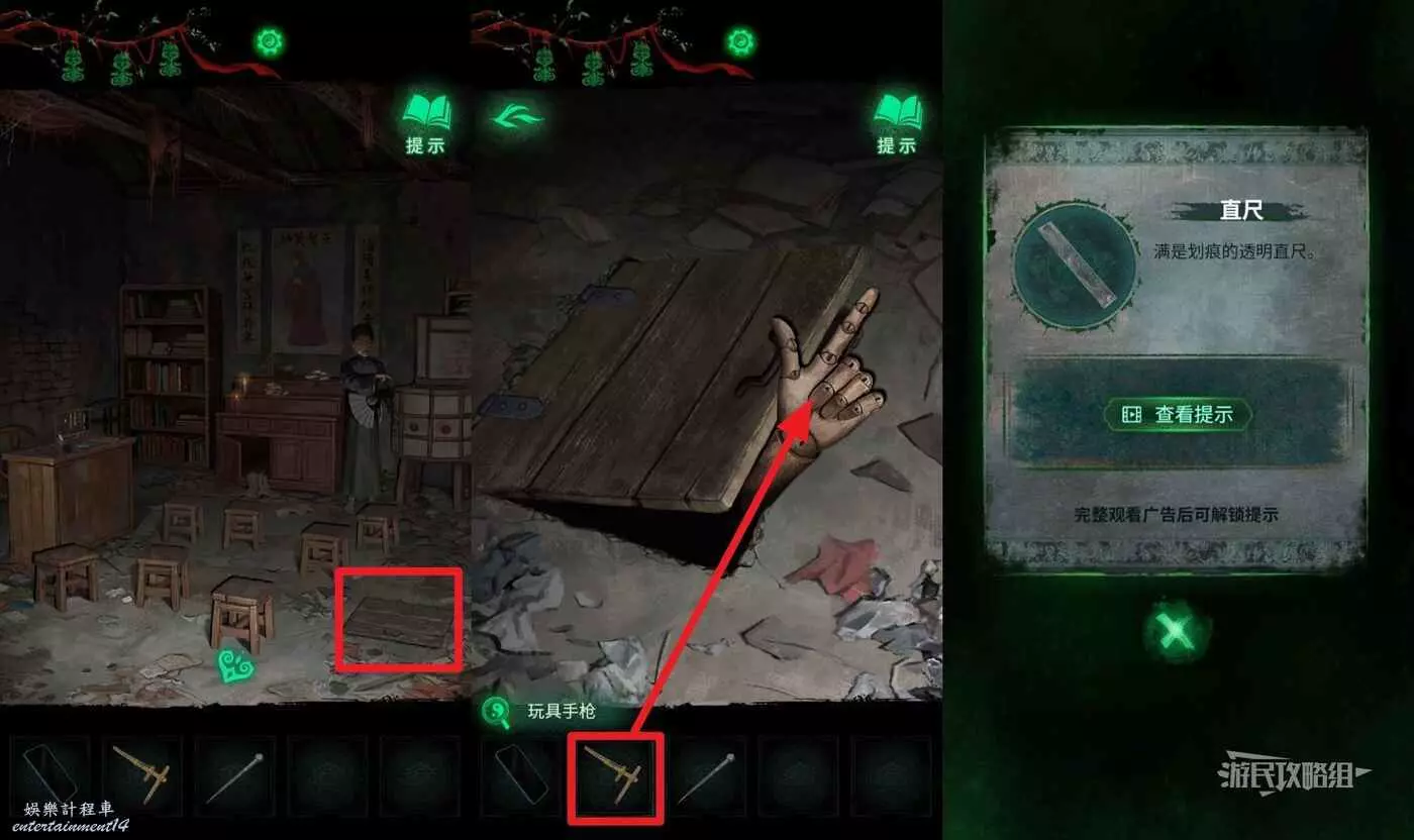 進屋之後,點擊右下方地上的門,在道具欄選擇【玩具手槍】放在伸出的手上,獲得【直尺】。