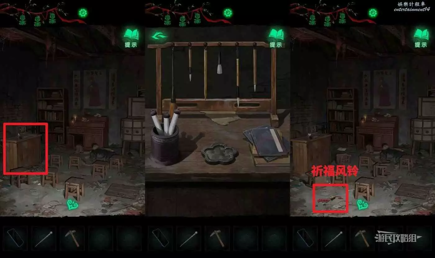 點擊學堂左側的桌子,根據【花硯台+書4卷軸3】以及地上的書的線索,放上對應數量的物品並改變毛筆懸掛順序,解開謎題。