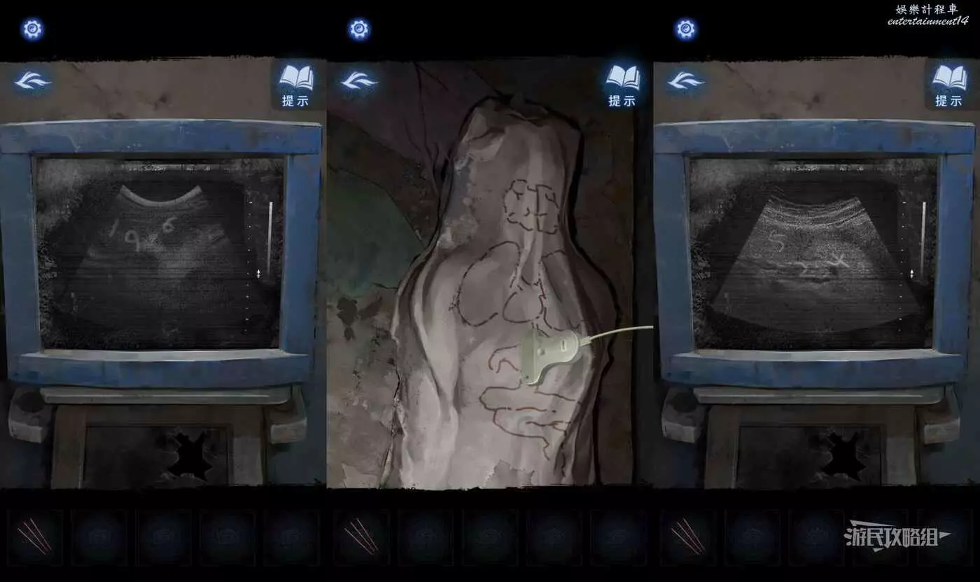 把探頭放在腦子圖案上,返回查看顯示幕,獲得密碼【196】,再把探頭移動到胃的圖案上,返回查看顯示幕,獲得密碼【524】。