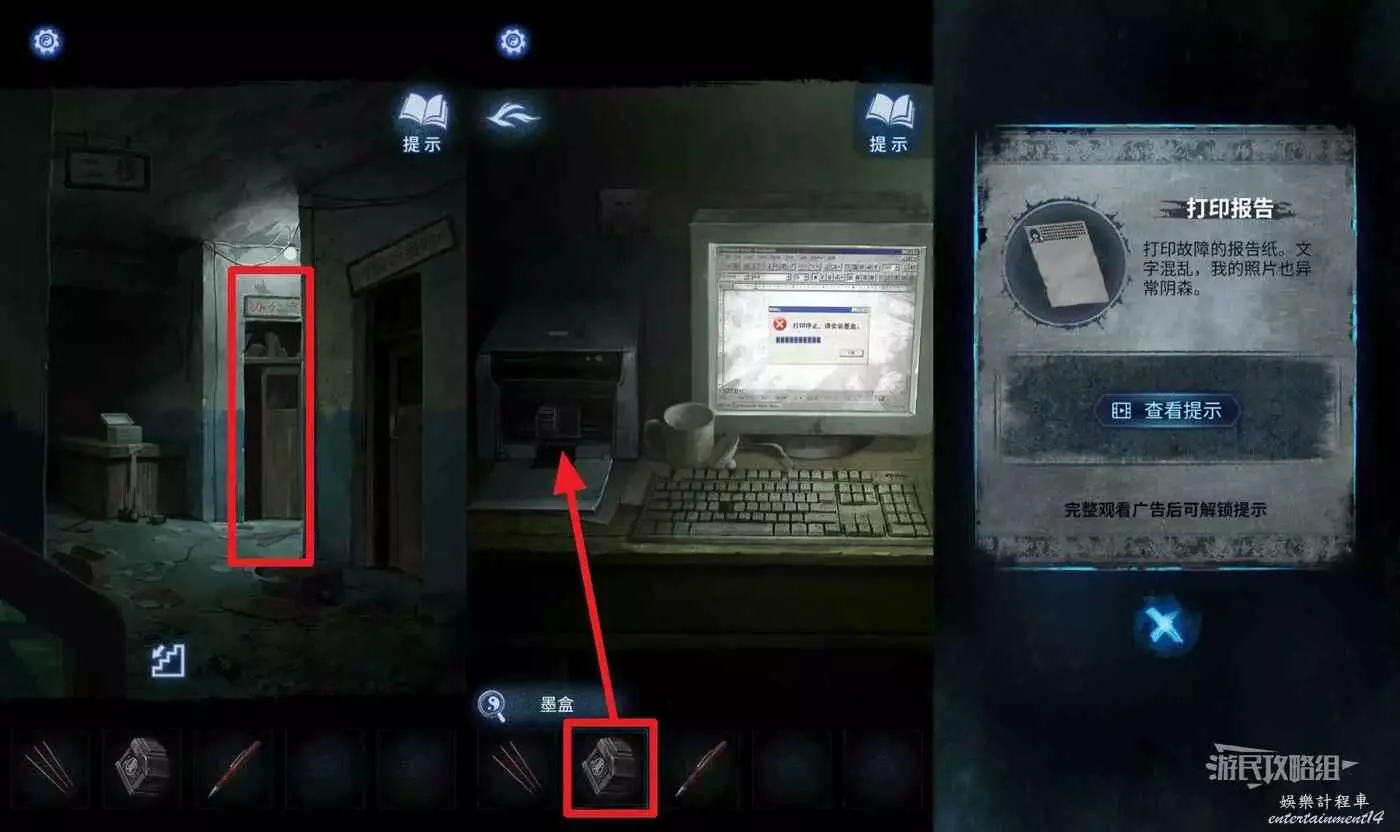 回到二樓走廊,進入辦公室,點擊房間中間的顯示幕,在道具欄選擇【墨水匣】放入電腦旁邊的印表機,獲得【列印報告】。