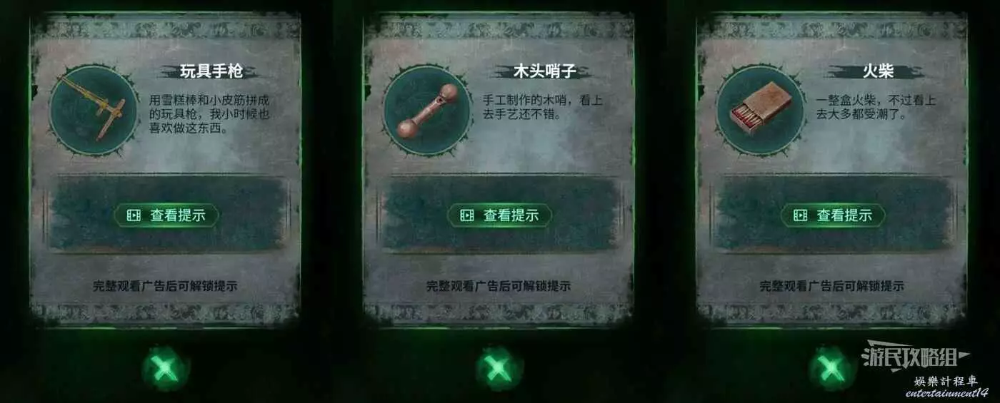 完成謎題後,分別點擊5個籃子拾取裡面的東西,獲得【玩具手槍】、【木頭哨子】、【火柴】。