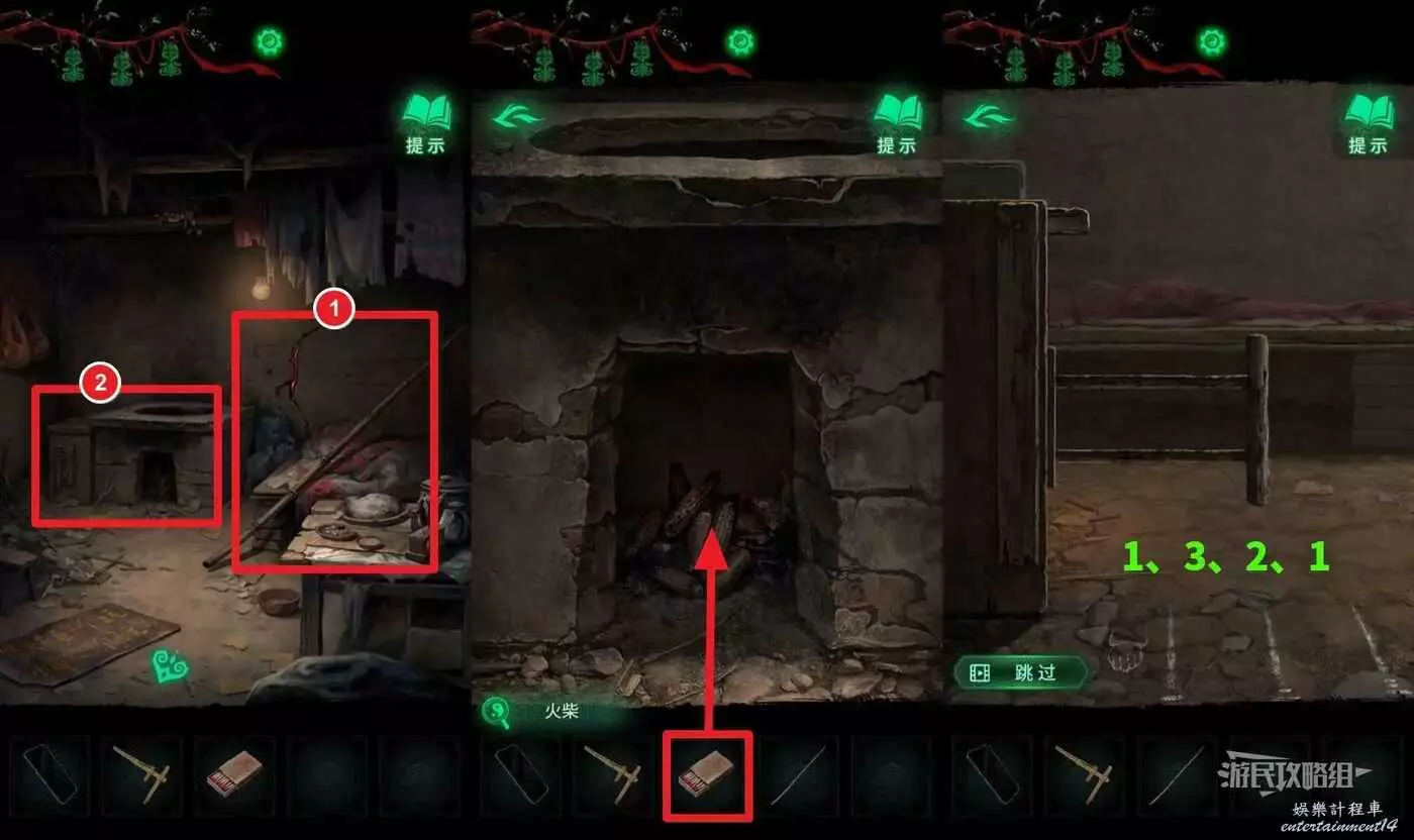 進入房間後,先拾取靠在床鋪上的晾衣杆,然後往左側看,有一個灶台和一個風箱,這裡需要先點灶台,在道具欄選擇【火柴】點燃灶台,然後返回再點擊灶台旁邊的風箱,按照之前在小賣部視窗用手機看到的提示拉動風箱,看地上有白色粉筆畫的標記,分別代表一、二、三,長按風箱把手,拖動到對應的標記位置後鬆手,視為拉動了一下,依次將風箱把手拉到一、三、二、一的位置,讓火生的更旺。