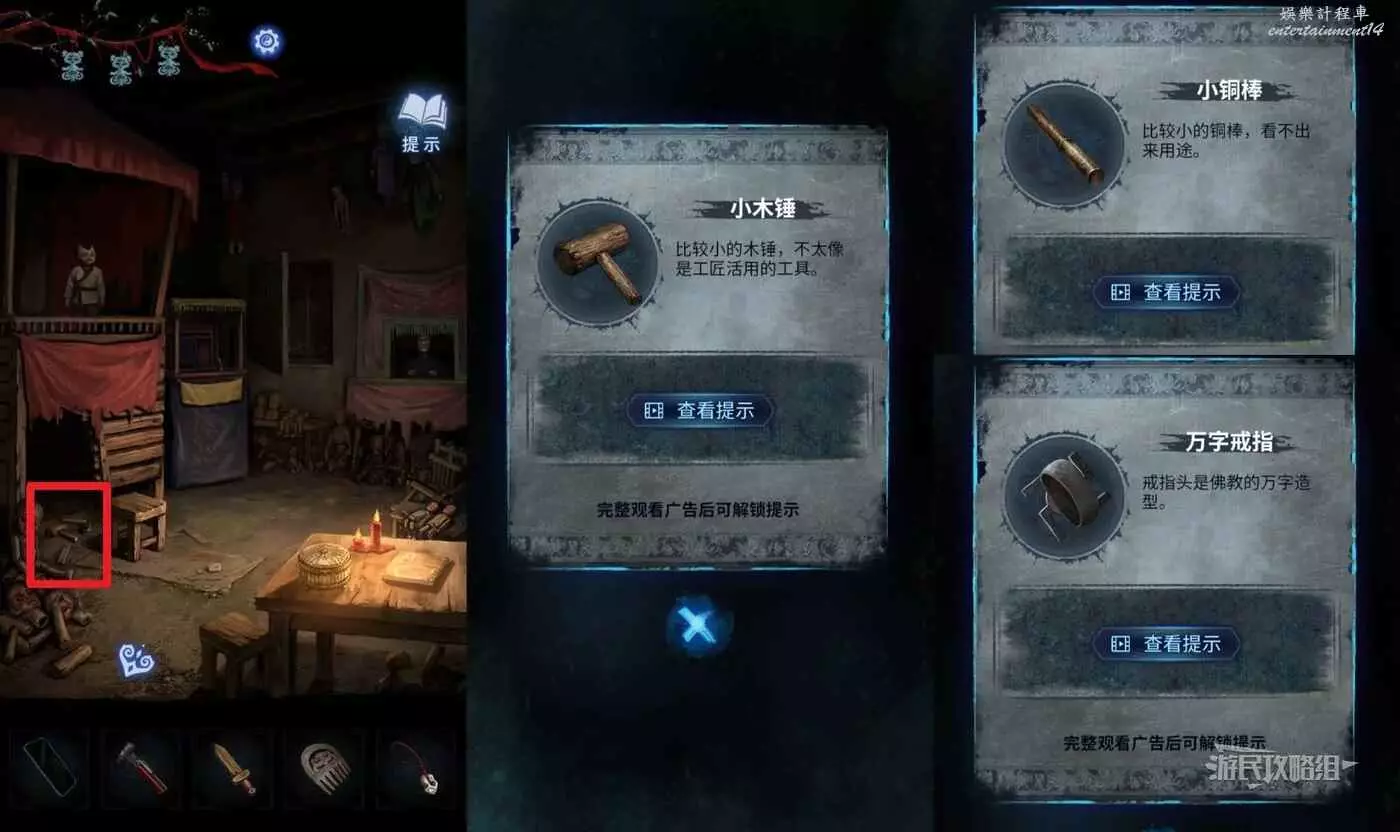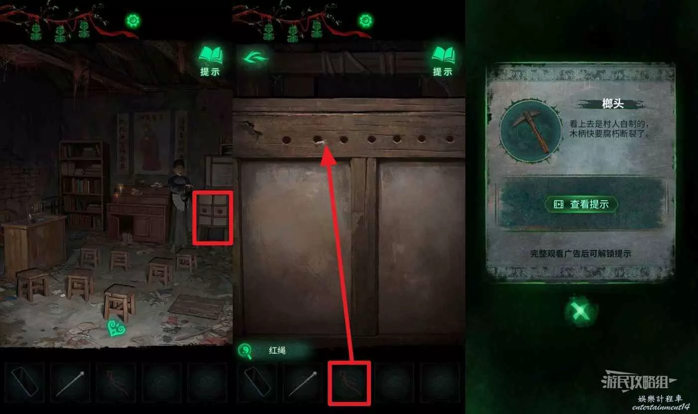 返回車旁邊的學堂,點擊說書木偶旁邊的白箱子,選擇【紅繩】系在斷掉的繩子上,再繼續點白箱子觸發劇情,獲得【榔頭】。