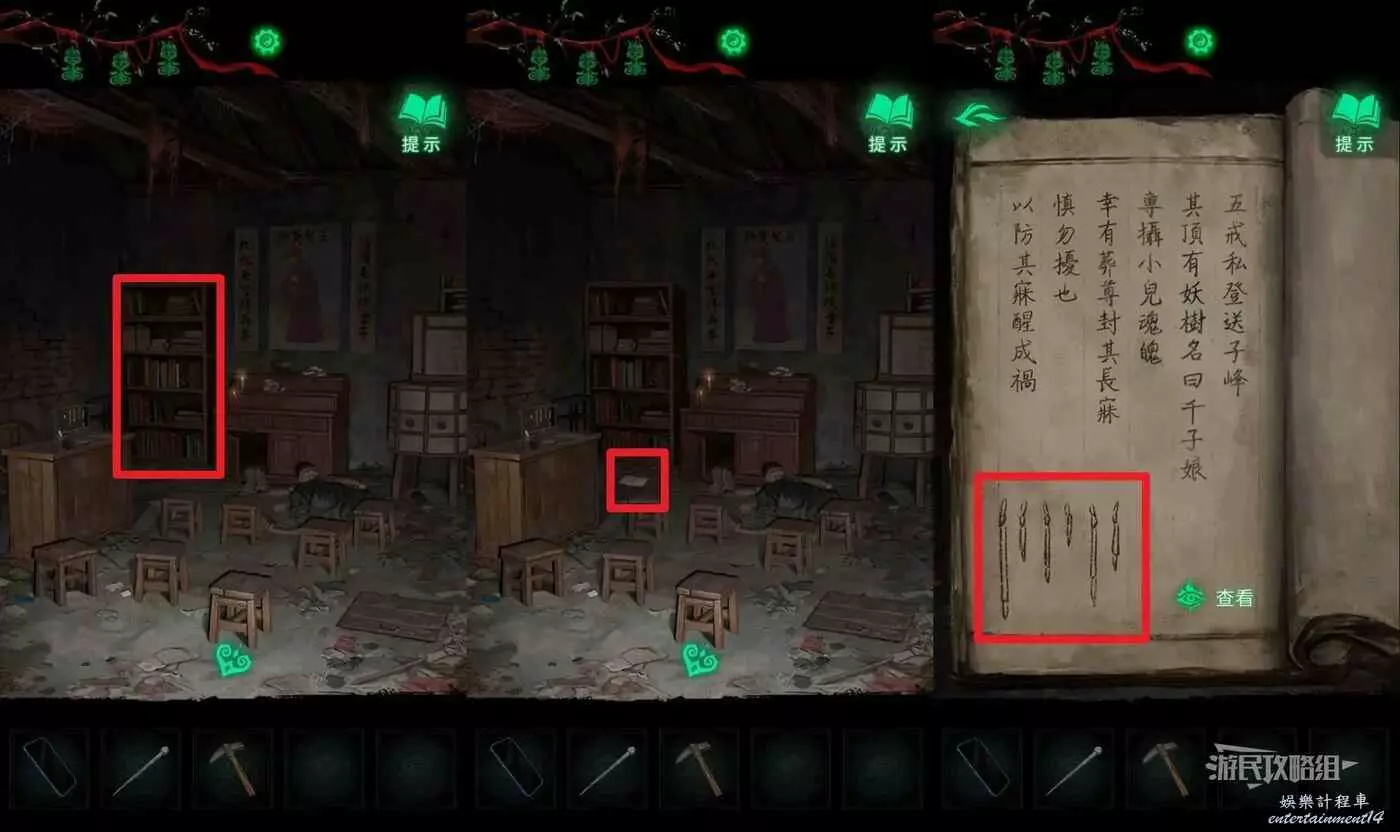拿到新線索之後進入【棄煞牢】,點擊右側桌子上的書,翻到第三頁獲得線索,然後點擊中間牆上的櫃子,根據線索打開櫃門。