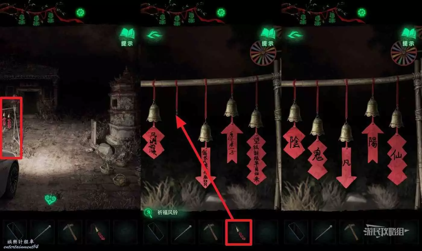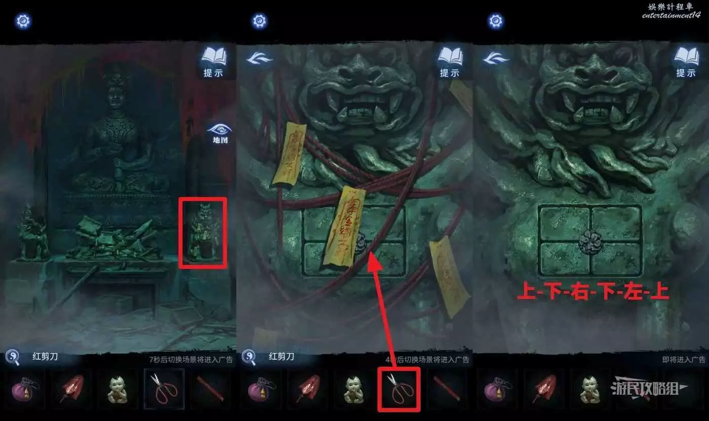打開地圖前往【奉奘祠】,點擊右側掛著符咒的雕像,選擇【紅剪刀】剪斷繩子,前方需要使用之前調整吹拉彈唱雕像時獲得的指向線索來移動按鈕。