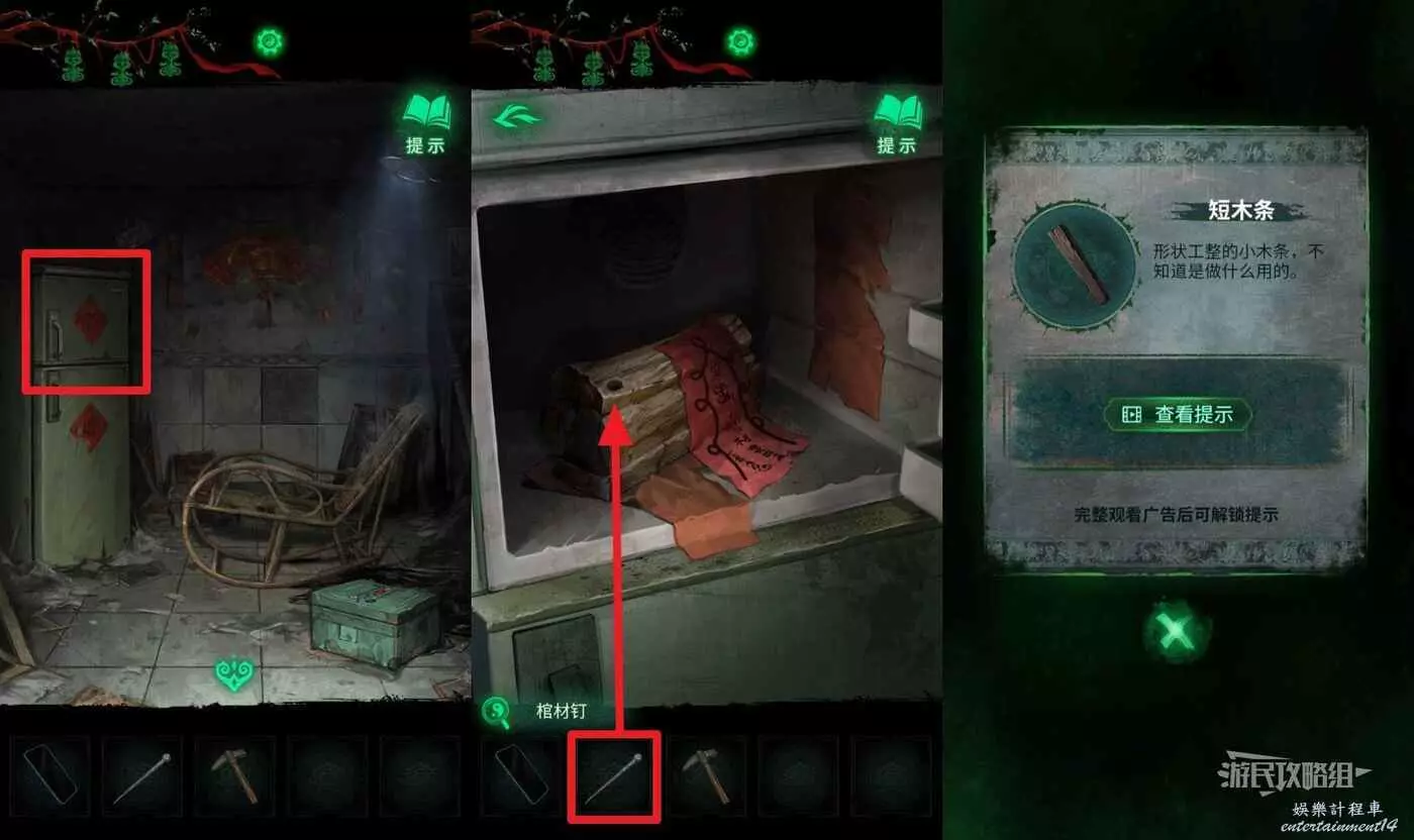 進入二樓的房間後,點擊左側綠色冰箱,在道具欄選擇【棺材釘】放在木棺上,再次點擊木棺,獲得【短木條】。