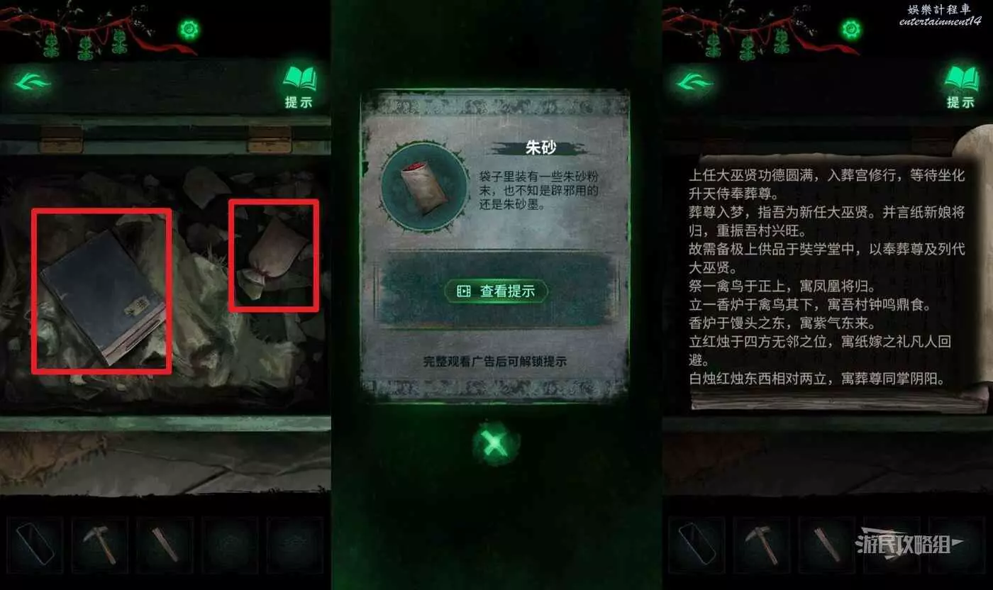 打開綠色盒子後,可以看到一個帳本,拾取【朱砂】,帳本上第二頁有供台的線索。