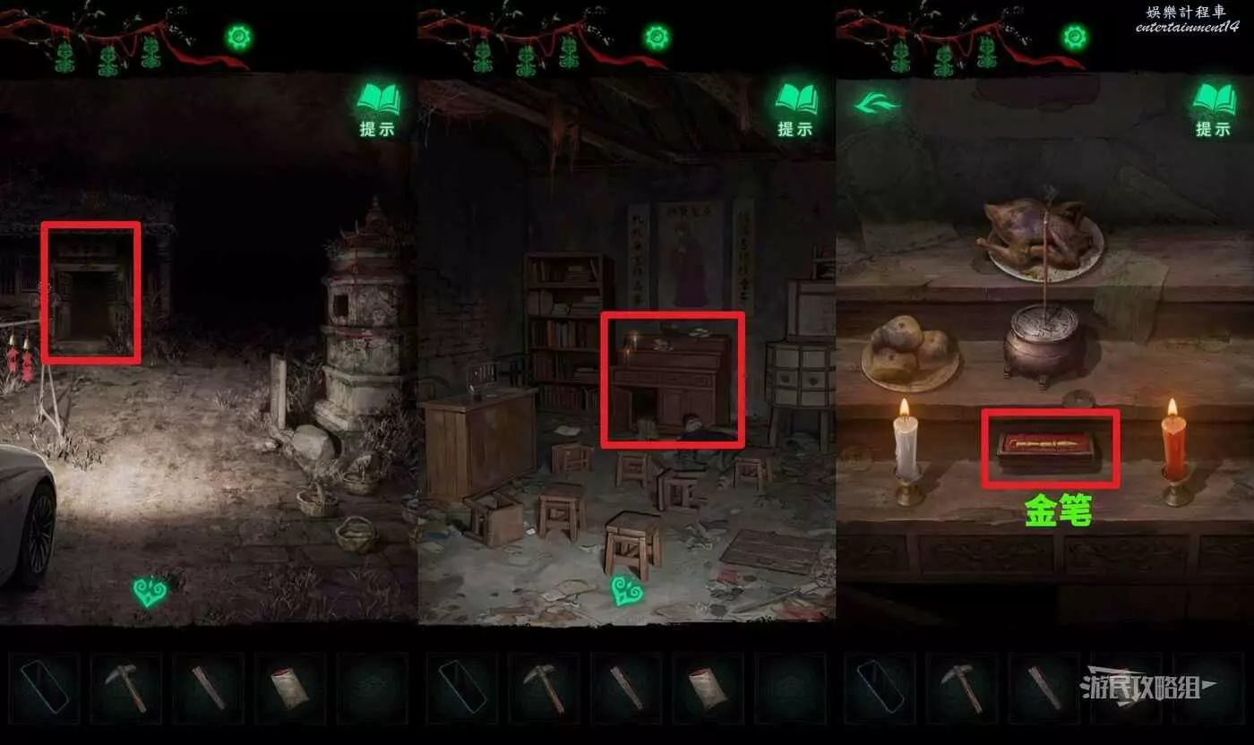 離開屋子,返回車旁邊的學堂,點擊中間的供台,按照帳本上的線索佈置供台,獲得【金筆】。供台佈置如下: