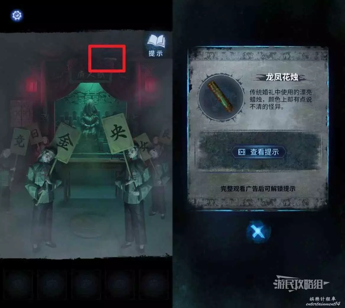 返回六禮軒,點擊畫面左上角的燈,在道具欄選擇【龍鳳花燭】放入缺少蠟燭的燈內,然後就可以橫向拖動所有燈的場景了。在最左側的燈下方可以看到點蠟燭的線索。