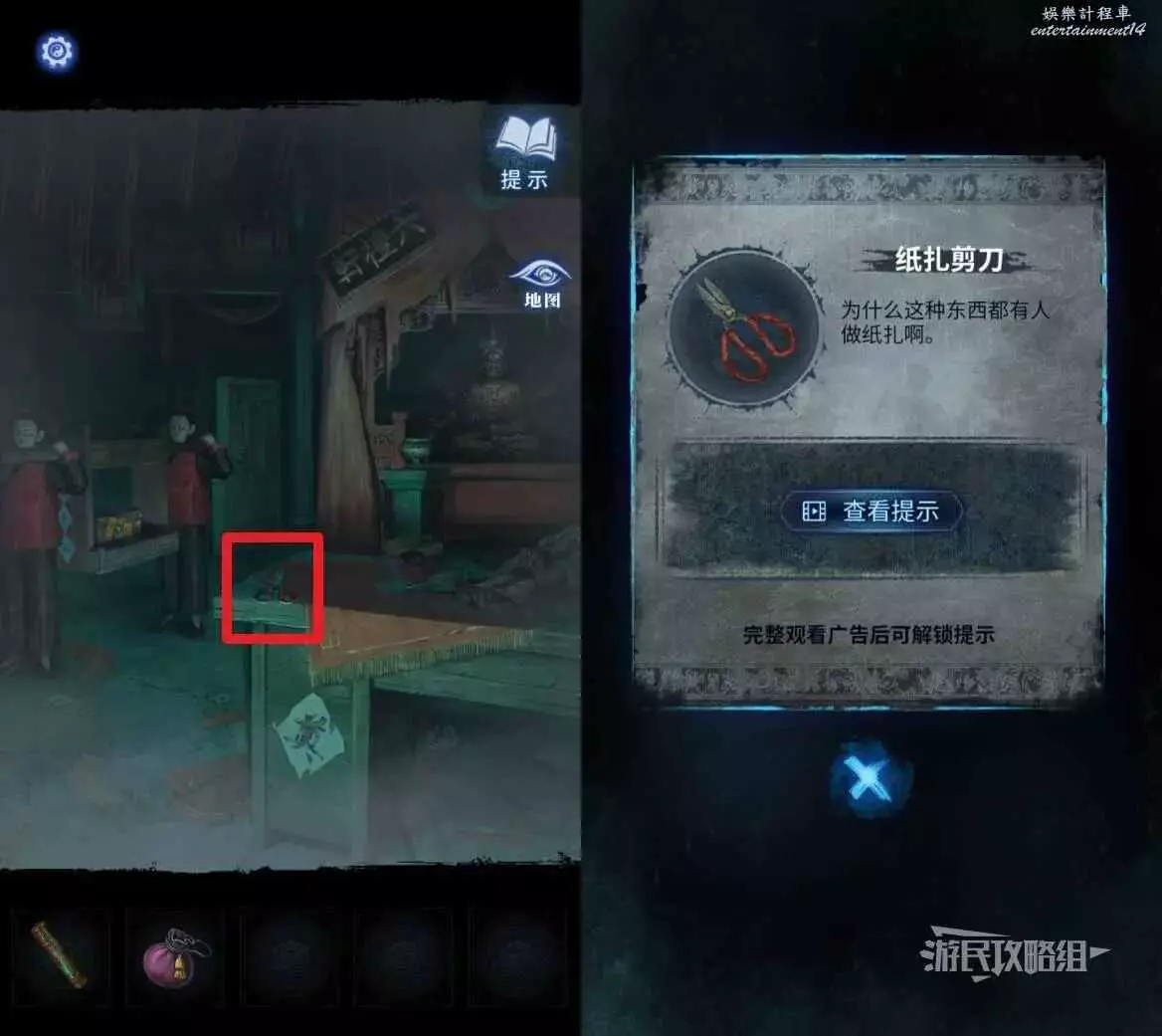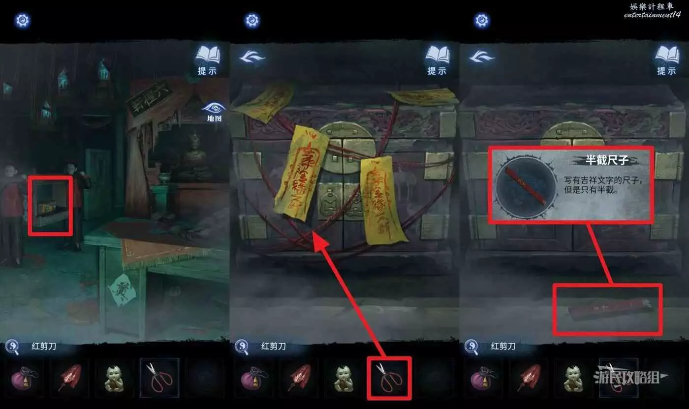 打開地圖返回【六禮軒】,點擊抬轎小人抬著的箱子,在道具欄選擇【紅剪刀】點開箱子上的紅線(有紙人突臉小高能),拾取【半截尺子】。
