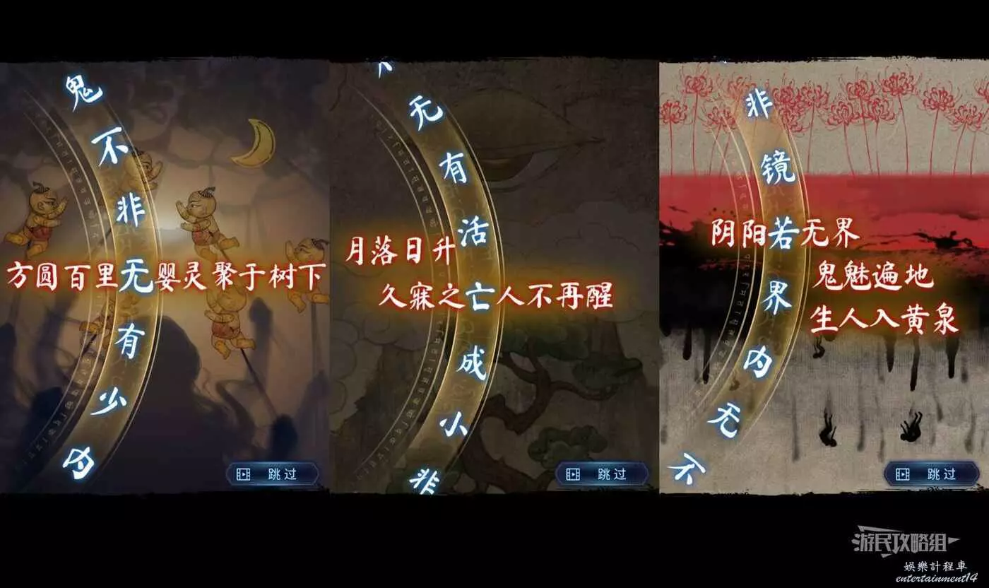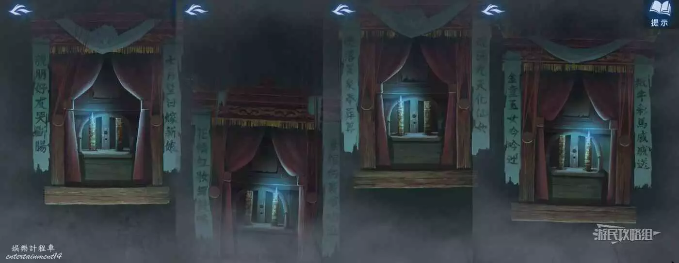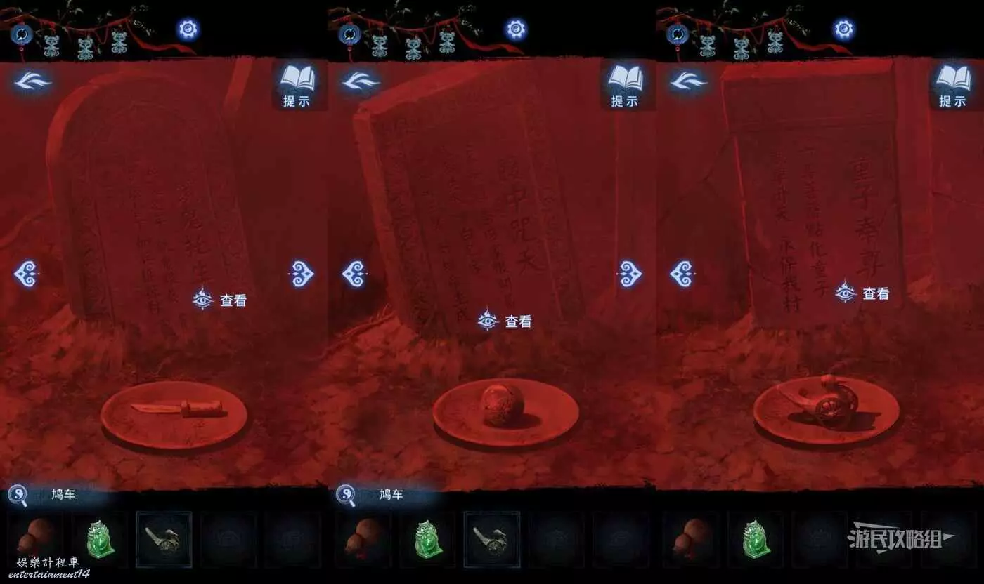 【聶莫琪視角】切換到聶莫琪視角,現在六葬雕像區域正下方的廟門已經開了,進入廟門。點擊畫面上的紅霧會出現墓碑,左右切換,觸發與明梅的對話。之後在每個墓碑前拾取盤子裡的貢品,這裡需要全部拾取之後,再給貢品換位置,貢品的線索就在碑文上。正確位置如下。
