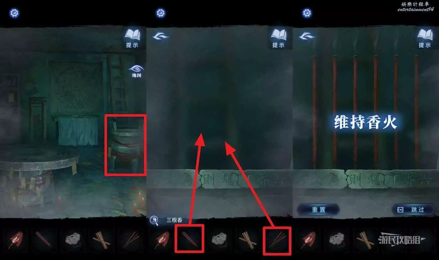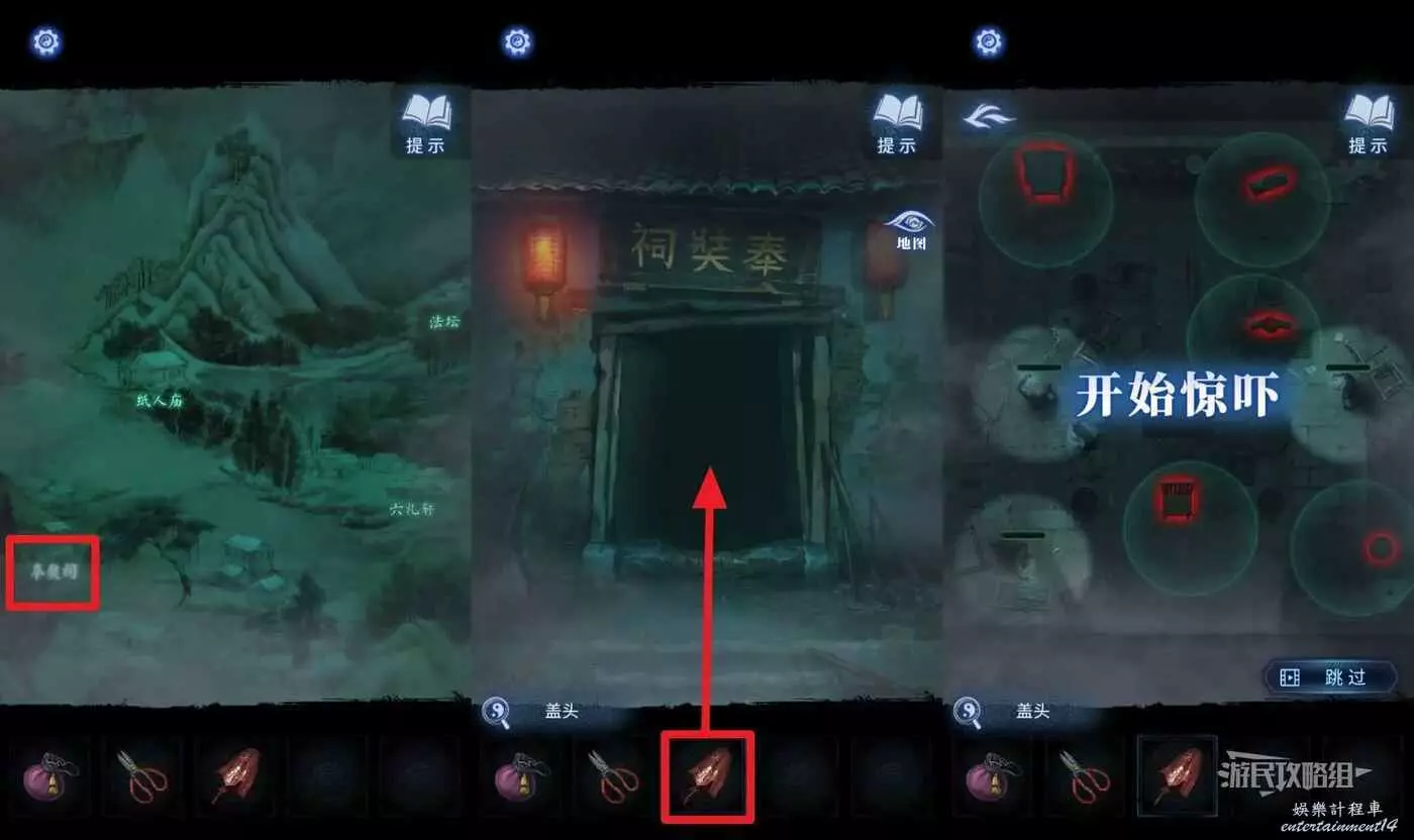 再次點擊【地圖】,來到【奉奘祠】,選擇道具欄中的【蓋頭】進門,觸發一個嚇人小遊戲,需要同時將三個人的驚嚇值全部拉滿才能完成小遊戲,如果嫌麻煩可以直接跳過。