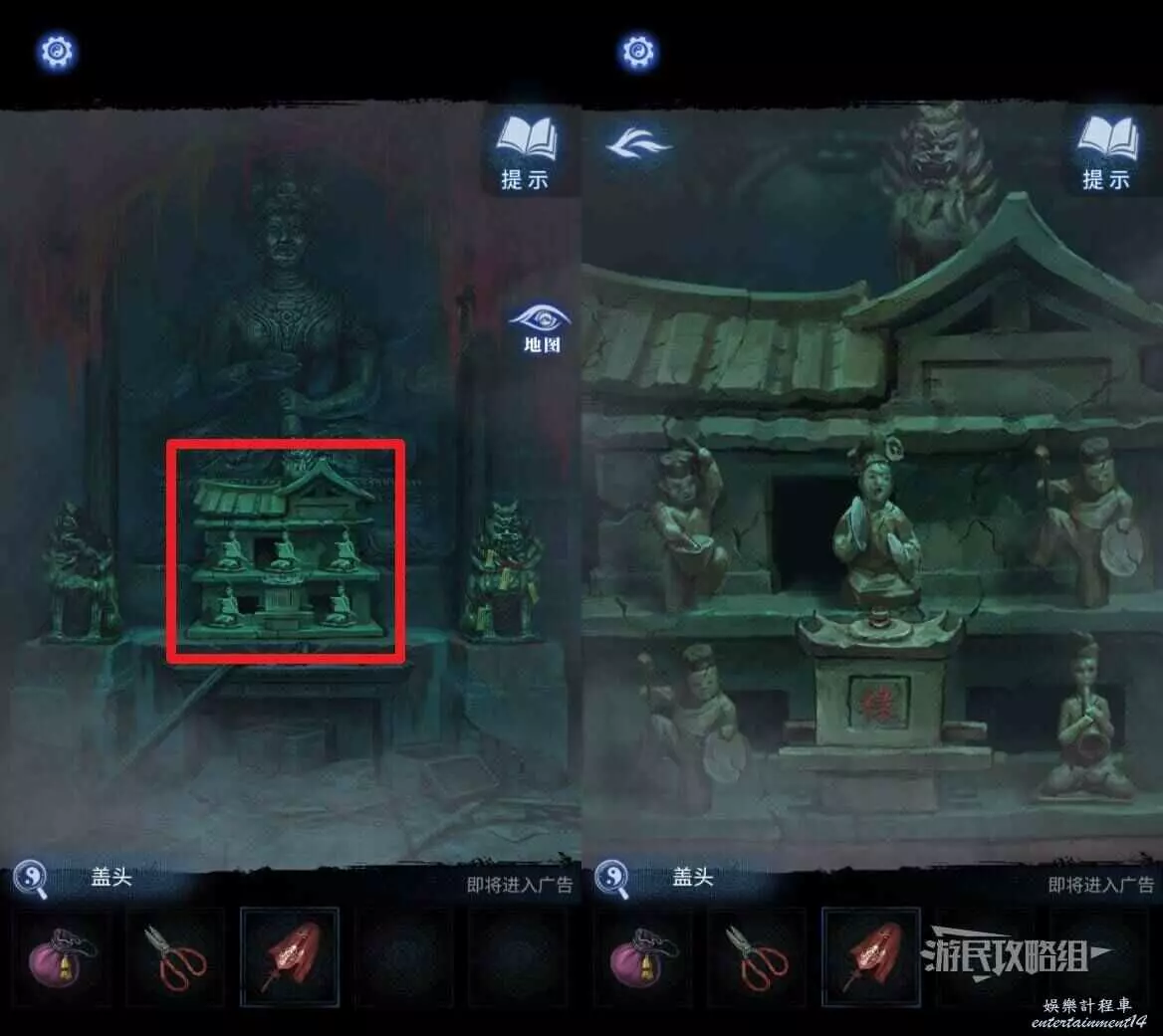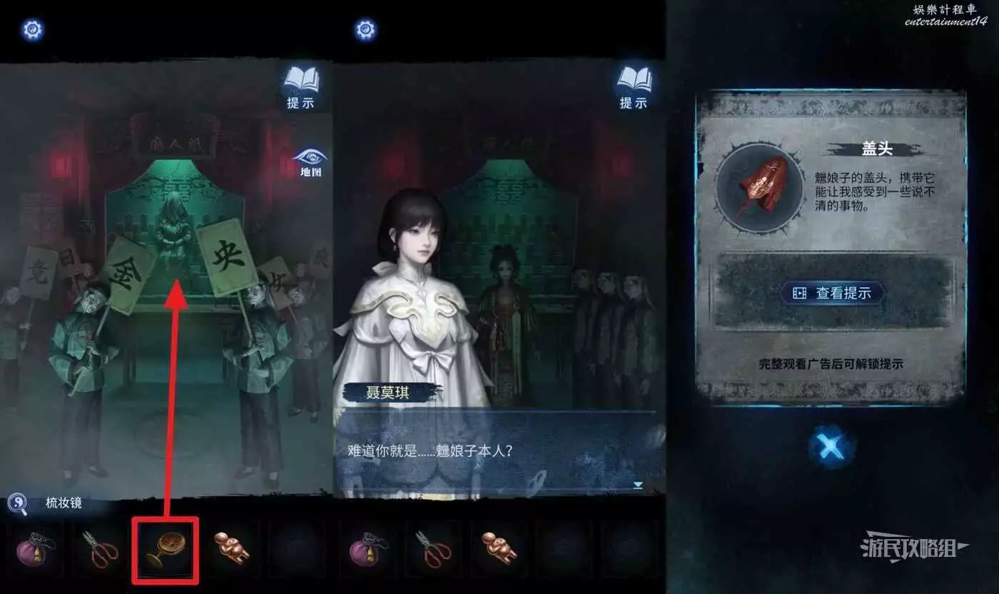 點擊介面右側【地圖】,返回【紙人廟】,在道具欄選擇【梳妝鏡】放在雕像下方,觸發劇情,獲得【蓋頭】。