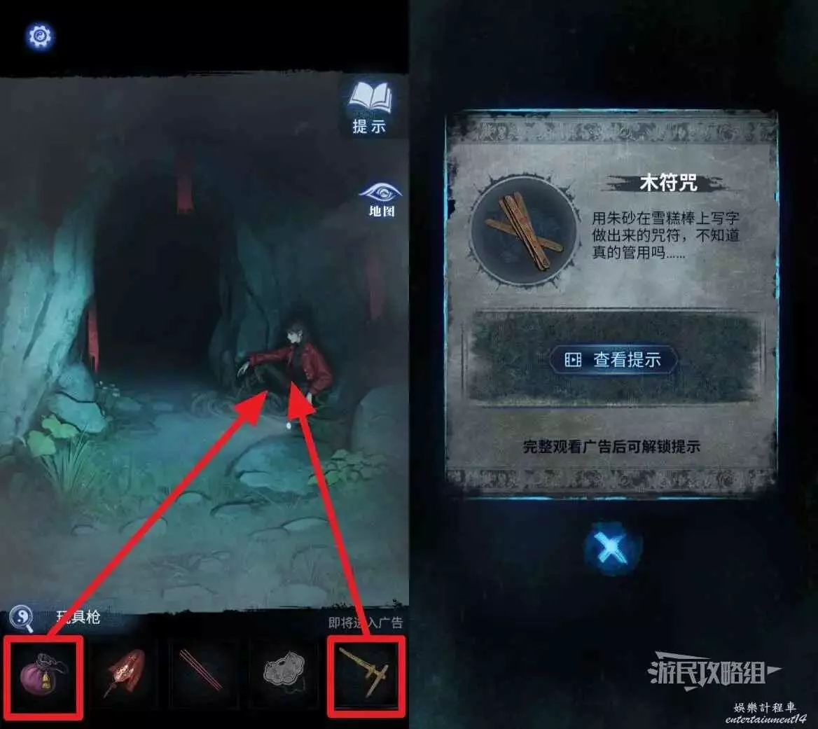 打開地圖前往【山洞】,選擇道具欄中的【玩具槍】和【朱砂香囊】交給聶莫黎,獲得【木符咒】。