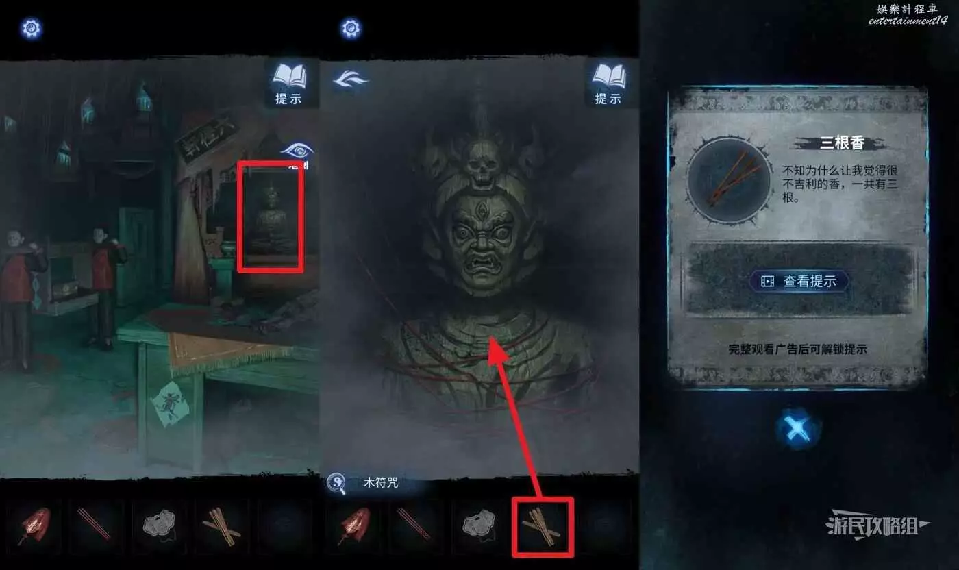 打開地圖前往【六禮軒】,點擊右側的木制雕像,在道具欄選擇【木符咒】,獲得【三根香】。