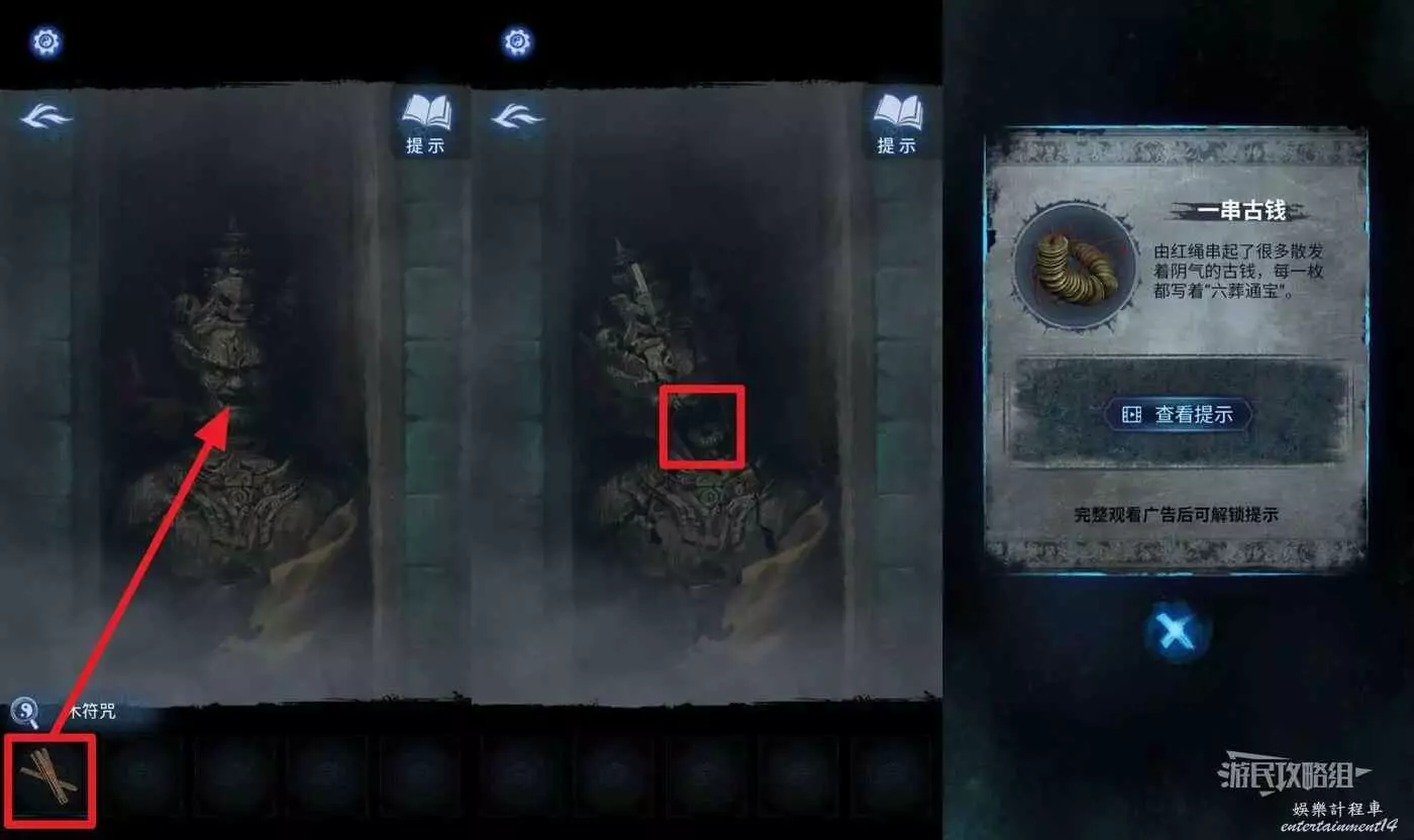 在道具欄選擇【木符咒】放在木雕上,拾取【一串古錢】。