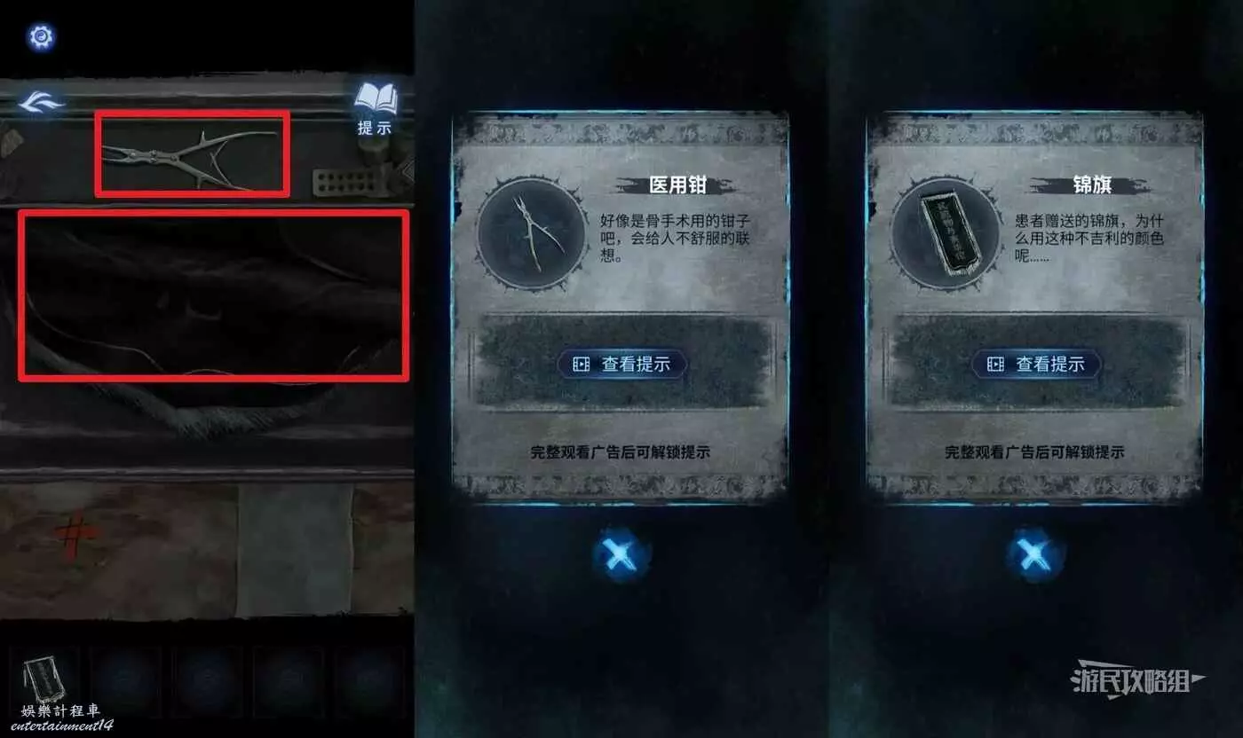 解開謎題後,打開醫療箱,拾取【醫用鉗】和【錦旗】。