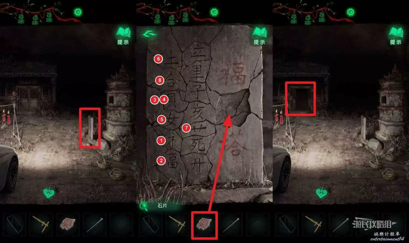 回到村口湯婆婆所在位置觸發劇情,看完劇情後,回到剛進村的車旁,點擊石碑,選擇道具欄中的【石片】放入石碑,然後依次點擊旁邊的偏旁部首,組成【福嬰塔】三個字,開啟左側的屋門,進門。