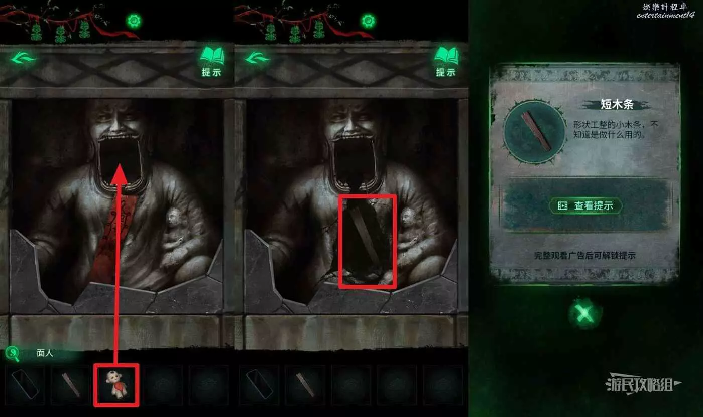 敲碎瓷磚後,選擇道具欄中的【面人】放入瓷磚後雕像的嘴裡,拾取【短木條】。